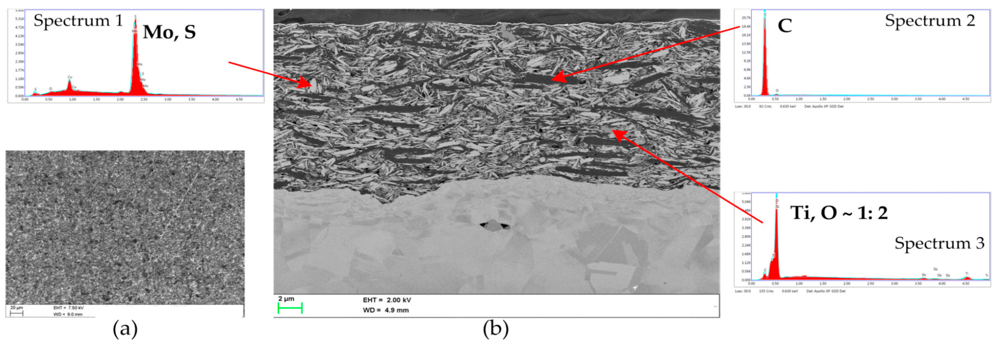 To characterize the composition and structure of the polymer coating layers, high-resolution scanning electron microscopy (SEM) and energy-dispersive X-ray spectroscopy (EDX) analyses were conducted. Local sample preparation was further performed using ion slicing technology. Figure 2 presents the analytical results for PB_1, highlighting that the polymer coating featured a densely packed structure. Distinct phases are observable in the SEM-derived material contrast images of the surface (Figure 2a) and cross-section (Figure 2b). EDX point analysis, coupled with corresponding X-ray spectra, enabled the identification of three distinct fillers. First, molybdenum and sulfur were detected at an atomic ratio of 1:2 (Spectrum 1), confirming the presence of MoS2 phase—which appeared to serve as the primary filler. Additionally, larger carbon-rich phases (indicating graphite) were visible, as illustrated in Spectrum 2. Distributed between these phases were smaller particles composed of titanium and oxygen at a 1:2 ratio; these particles were thus inferred to be TiO2 (Spectrum 3). Owing to the dense packing of the filler materials, regions of pure polymer matrix were scarcely detectable [].