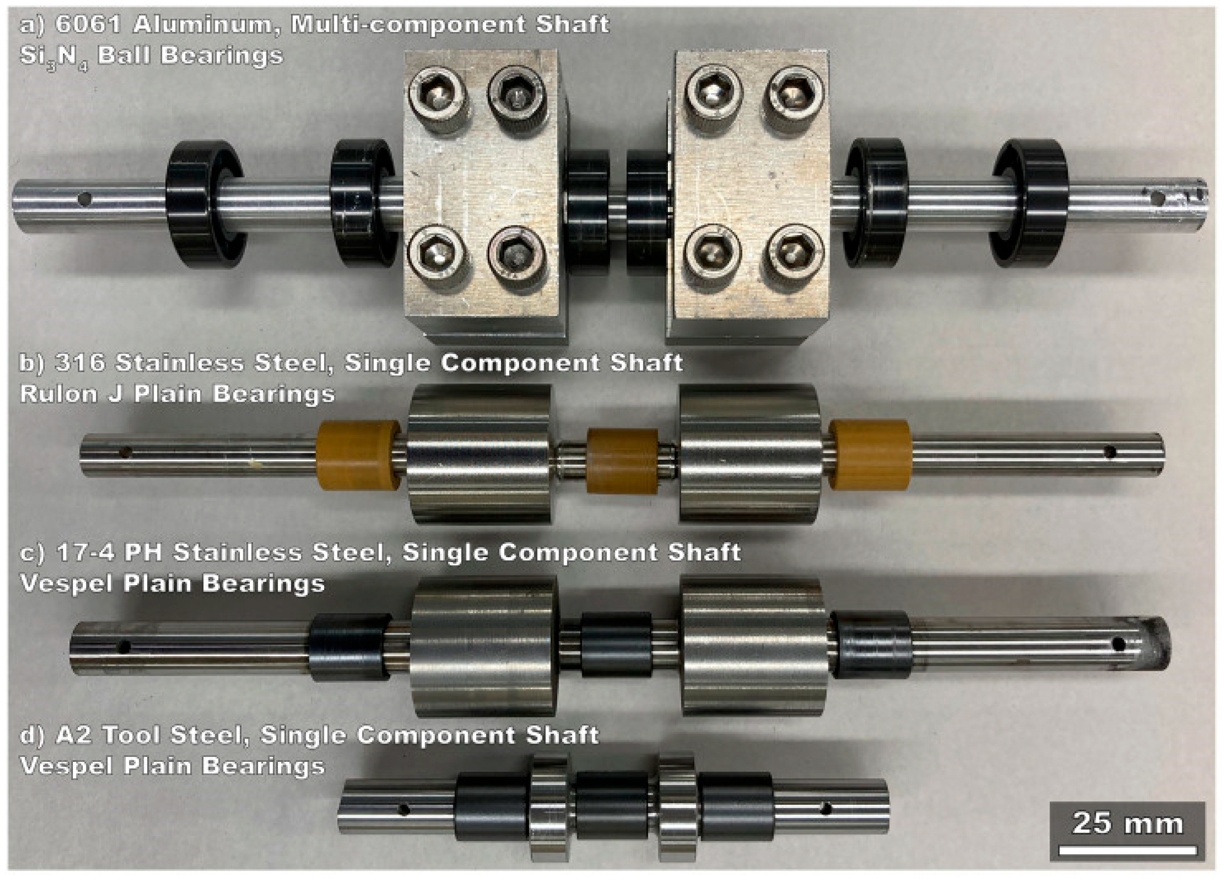 Shaft-bearing combinations. (a) is 6061 aluminum multi-component shaft mated with Si 3N4 ball bearings. (b) is a 316 stainless steel single assembly shaft with Rulon J plain bearings. (c) is a 17-4 precipitation-hardened stainless steel single assembly shaft with Vespel® polyimide plain bearings. (d) is an A2 tool steel, one-component crankshaft with Vespel® polyimide plain bearings. Reprinted with permission from Ref. []. 2022, Elsevier.