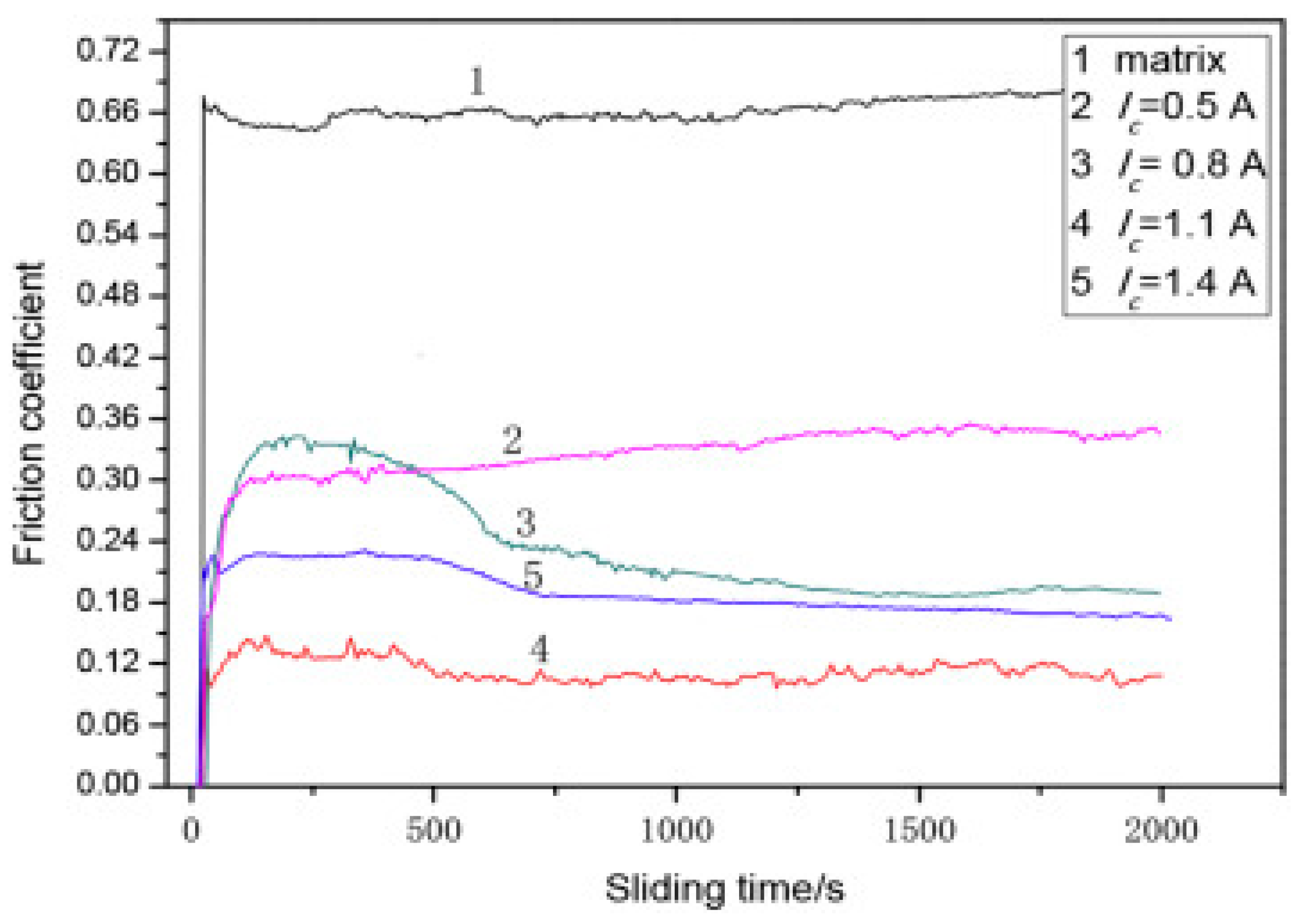 Sliding bearing materials mainly include Babbitt alloys, copper alloys, iron alloys, and aluminum alloys. Babbitt alloys have excellent anti-friction, anti-seizure, embeddability, and run-in properties; however, their load-carrying capacity, heat resistance, and fatigue resistance are poor. Song investigated the structure and performance of tin-based Babbitt alloy bearings. Copper alloys have good thermal conductivity, high load-carrying capacity, high melting point, and excellent heat resistance, but they are expensive []. Koseki et al. focused on metal wear issues in metal-on-metal joint replacements, applying carbon ion implantation (CII) and diamond-like carbon (DLC) films to cobalt-chromium alloy substrates via plasma source ion implantation to reduce wear and corrosion. The study evaluated the tribological properties of the coatings using geometric wear tests under high contact pressure (1030 MPa). Results showed that CII-coated bearings exhibited less wear, lower friction coefficients, and higher resistance to catastrophic damage even under high pressure, outperforming uncoated Co-Cr alloys and DLC coatings. The study suggested that CII-coated surfaces have potential as hard coatings for joint surfaces []. To regulate the structure of nickel-based high-temperature alloy aluminide coatings, Pedrizzetti et al. employed a slurry aluminizing process, combined with SEM, EDS, and XRD analyses to study the effects of key parameters. The results indicate that an initial slurry thickness of 100 mg/cm2 lays the foundation for structural regulation, and an aluminum vapor concentration of 6.50 mg/cm3 can form an 80 μm full β-NiAl phase coating. Moreover, this parameter can be used to prepare a dual-phase platinum-modified aluminide, providing a pathway for directional structural control []. Zhi et al. prepared five CrNiBN coatings with different Ni contents by magnetron sputtering to enhance the seawater corrosion resistance of CrBN coatings, and analyzed their performance using X-ray diffraction and electrochemical tests. The results showed that the coating had the best corrosion resistance when the Ni content was 7.28 at%, but the corrosion resistance decreased when it exceeded 12.54 at%. However, all CrNiBN coatings exhibited better corrosion resistance than CrBN coatings, with corrosion inhibition efficiency increased by 12.53 times [].