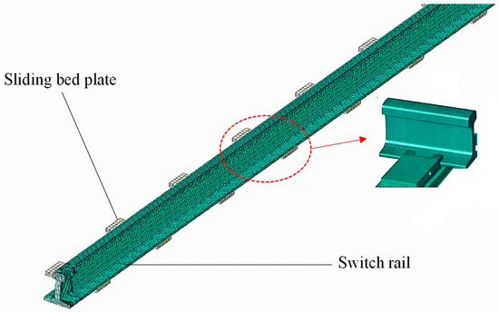 Both the switch rail and the slide plate adopt isotropic materials without considering the plastic deformation of the structure. The switch rail material is U75V, and the slide plate adopts Q235A. Specifically, the switch rail has a density of 7790 kg/m3, an elastic modulus of 206 GPa, and a Poisson’s ratio of 0.3; the slide plate has a slightly higher density of 7850 kg/m3, an elastic modulus of 210 GPa, and the same Poisson’s ratio of 0.3.