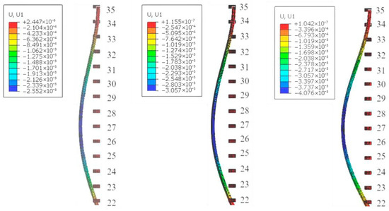 As shown in Figure 6, insufficient displacement of the switch rail is significantly reduced under the influence of lateral wheel–rail force compared with the insufficient displacement in Figure 4. Under different friction coefficients, the deformation of the switch rail first increases. Then, it decreases laterally, and the maximum displacement occurs correspondingly at sleeper No. 25. When the friction coefficients are 0.25, 0.3, and 0.4, respectively, the maximum insufficient displacement of the switch rail is 0.19 mm, 0.22 mm, and 0.29 mm. As shown in Table 3, the maximum displacement of the switch rail under different friction coefficients is reduced by about 90% compared with under conditions with no later wheel–rail force.