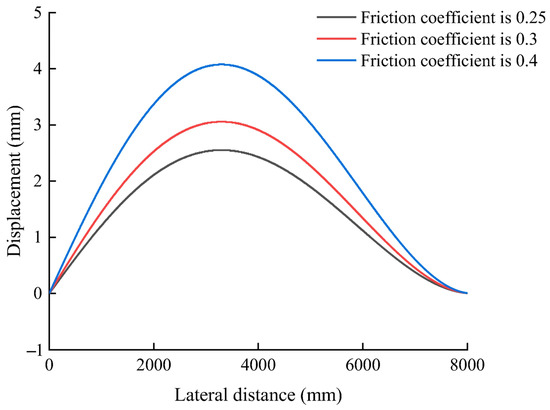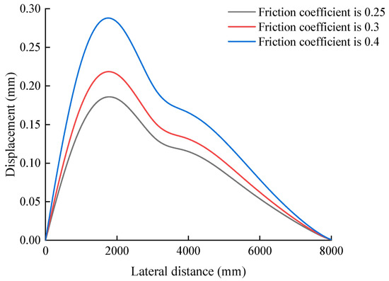 As shown in Figure 3, when the friction coefficient increases from 0.25 to 0.4, the switch rail has a more obvious displacement, indicating that the higher the friction level between the switch rail and the slide plate, the greater the stress and insufficient displacement of the switch rail. It is worth noting that under different friction coefficients, the maximum insufficient displacement of the switch rail occurs at sleeper No. 27. Further, this paper studies the variation in lateral insufficient displacement values of the switch rail under different friction coefficients, as shown in Figure 4.
