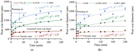 Figure 3 shows the evolution of the wear scar diameter (WSD) on the steel balls lubricated with the calcium-based grease under different contamination conditions, including various concentrations of irregularly shaped SiO2 particles and the presence of 0.0 wt% and 0.6 wt% water. Across all the test conditions, the wear process can be divided into two distinct regimes: the running-in phase and the steady-state phase. The running-in period, typically occurring within the first 40 min, is characterized by a rapid increase in the WSD. Following this, the wear rate tends to stabilize, marking the onset of the steady-state phase, where the wear mechanism becomes more uniform and predictable. The phase transitions in the figure demonstrate that clean grease and grease contaminated with water only maintain a clear distinction between running-in and steady-state. However, the presence of particle contaminants, in a separated state or in combination with water, prolongs the running-in phase and shifts the steady-state wear behavior toward more aggressive regimes. In the dry condition (0.0 wt% water), the base grease exhibited the smallest and slowest increase in the WSD. Consider a precision mechanical component with an allowable wear limit diameter of 800 μm, as shown by the dashed line. The regression model for Ca_G, Y = 300X0.092, indicates mild wear progression. The WSD reached the wear limit at approximately 42,869 min under accelerated grease degradation conditions, suggesting effective lubrication performance in the absence of contaminants. With the addition of 0.158 wt% particles, the WSD increased moderately, described by Y = 330X0.237, and approached the assumed wear scar limit at approximately 42 min. At 1.480 wt% SiO2, the WSD increased significantly and approached the failure threshold in 3 min, revealing the severe abrasive effect of hard particles. In contrast, under the water-contaminated conditions (Figure 3b), the wear behavior varied depending on the combined presence of water and particles. In the 0.6W case, the WSD followed a more gradual trend, with the regression Y = 325X0.065, and reached the wear limit at approximately 1,024,405 min. This indicates that while water softened the grease structure by reducing its consistency (Table 3), the overall wear remained relatively controlled. However, when a low concentration of SiO2 particles was added alongside water (0.6W0.185S), the wear progression became more aggressive, described by Y = 341X0.227, and approached the critical wear scar limit at 43 min. Severe wear behavior was also observed in the 0.6W1.480S condition, with Y = 559X0.226, where rapid WSD growth exceeded the assumed wear scar limit at approximately 5 min. Overall, the synergy between water and abrasive particles can slightly decelerate the wear severity caused by the particles.