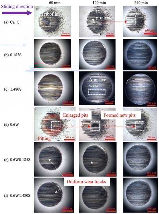 Surface morphology evolution of wear scars during the wear tests.