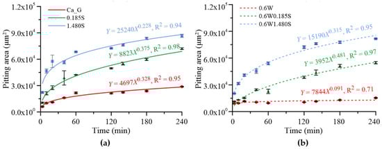 Microscopic examination of the wear scar surfaces, as shown in Figure 6, revealed pitting damage, particularly in the samples contaminated with high concentrations of SiO2 particles with or without water. Figure 7 illustrates the pitting area evolution measured on the wear scar surfaces as a function of sliding time for greases with different contamination conditions. Pitting, characterized by small localized craters on the contact surface, was most evident in the 1.480S and 0.6W1.480S samples after prolonged wear durations. This damage is attributed to the hard, irregularly shaped SiO2 particles acting as abrasive third bodies, repeatedly impacting the steel ball surface under cyclic loading. In these cases, the abrasive particles penetrated the lubricant film and induced micro-cutting or micro-fatigue, leading to surface crack initiation and eventual material detachment in the form of pits. Moreover, in the presence of water, the best-fit equation (Y = 15,190X0.315) demonstrates the synergistic effect of particle and moisture contamination on accelerating fatigue wear and surface degradation. The increased pitting rate in these samples is attributed to the combined effects of third-body abrasion and potential water-induced corrosion fatigue. Conversely, minimal pitting was found on the wear scars of the clean grease and the low-concentration SiO2 sample (0.185S), suggesting that the grease film under these conditions remained sufficiently intact to resist localized stress concentrations.