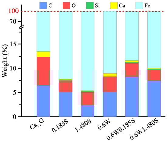 Table 3 summarizes the changes in water content, TAN, and consistency (NLGI grade) of the grease samples in the initial and post-test conditions. For the base grease (Ca_G), a slight increase in water content and a decrease in TAN were observed, suggesting mild degradation []. The addition of SiO2 particles (0.185S and 1.480S) led to a noticeable increase in TAN after wear, especially at higher concentrations. This indicates accelerated oxidation or chemical degradation, which agrees with findings that particulate contaminants promote chemical reactions and increase the acid number of lubricants []. In the water-contaminated samples, the initial water contents were higher than in the base grease but decreased after testing, suggesting evaporation or interaction with metal surfaces during wear. The presence of water changed the rheological properties of the greases, as structural integrity depends on thickener type and, subsequently, water escapes during shear and heating []. The TAN values in these samples also increased after wear, particularly in the presence of a high SiO2 content, suggesting that the combined effect of water and abrasive particles accelerates oxidation and possibly corrosion. In terms of consistency, most greases exhibited slight changes in NLGI numbers after the tests. The water-containing samples tended to show lower NLGI numbers, indicating a softening grease structure. Overall, calcium-based lubricating grease naturally absorbs moisture from the environment, where a higher SiO2 content leads to relatively higher moisture levels. Regardless of the initial grease moisture content, post-operation moisture levels stabilize between 0.25 wt% and 0.40 wt%, indicating that the operating system maintains a stable moisture content. For the calcium-based lubricating grease under the specified moisture and particle concentration conditions in this study, the TAN values before and after the experiments remained between 3.20 and 4.66, indicating that the two environmental contaminants have a relatively minor impact on TAN.