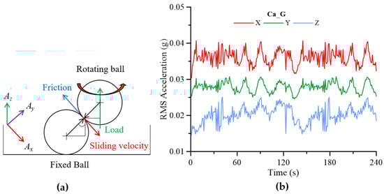 To enhance signal clarity and isolate periodic components related to the shaft motion, the Time Synchronous Averaging (TSA) method was applied during post-processing. This technique effectively reduces random noise and highlights repeatable patterns associated with mechanical interactions. The vibration data were synchronized with the shaft’s rotational speed of 1600 rpm throughout the test. By aligning the signal with the rotational cycle, the TSA method more precisely evaluates periodic disturbances caused by frictional contacts and the presence of wear debris or contaminants. Figure 10a presents the measured vibration signals along three directions: Ax (sliding direction), Ay (radial direction), and Az (normal to the contact surface, parallel to the applied load). Figure 10b shows the root mean square (RMS) acceleration in each direction for the base grease without contaminants, obtained during sliding after noise removal using TSA signal processing. The Az vibration primarily reflects changes in the applied load or test setup rather than the influence of contaminants. Vibration in the Ay direction shows moderate amplitude, higher than Az but lower than Ax, indicating limited sensitivity to dynamic contact variations. The Ax direction exhibits the highest vibration amplitude due to its alignment with the frictional motion, thereby serving as the most responsive axis to interactions at the sliding interface. Consequently, the Ax signal is selected for detailed analysis, as it effectively captures vibration characteristics associated with frictional behavior and the presence of solid contaminants.