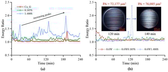 Figure 13 presents the variation in the ER during the wear tests under different contamination conditions. The results reveal a correlation between vibration features and the progression of surface damage in the form of wear and pitting. Under clean grease and a low particle concentration, the ER value remained stable at approximately 1.0, reflecting smooth contact conditions where the vibration response was dominated by the deterministic, periodic vibration of the rotating ball with minimal irregularities. This corresponded to low wear and pitting, indicating that a low ER is characteristic of a healthy tribological interface. With 1.480 wt% particle contamination, the ER increased progressively and displayed sharp peaks, reaching values near 2.0 after 180 min of the wear process. These increases coincided with severe wear scars and the onset of extensive pitting. Pitting introduces localized discontinuities that induce impulsive excitations and high-frequency vibration, which are captured in the difference signal of the TSA analysis. As wear progresses, pits may accumulate and enlarge, generating stronger impulsive responses and leading to sharp increases in the ER. Conversely, some pits may wear out or flatten during sliding, temporarily reducing vibration intensity. This explains the ER fluctuations observed during long-term testing, as the contact surface evolves dynamically through cycles of pit initiation, growth, and partial removal. When water was introduced at 0.6 wt% together with particles, the ER values were lower than those of the particle-only cases at the same concentration. This confirms that water provided a mild damping as the liquid phase may absorb part of the frictional heat and soften the grease matrix, thereby reducing the stiffness of the contact interface. As a result, the impulsive vibration response caused by hard particles was partly reduced, leading to slightly decreased ER values compared to the particle-only conditions. However, the wear scar observations confirmed that surface degradation remained severe, with extensive pitting present after 120–140 min. This indicates that while water can moderate the vibration amplitude associated with particle impacts, it does not prevent the accumulation of damage.
