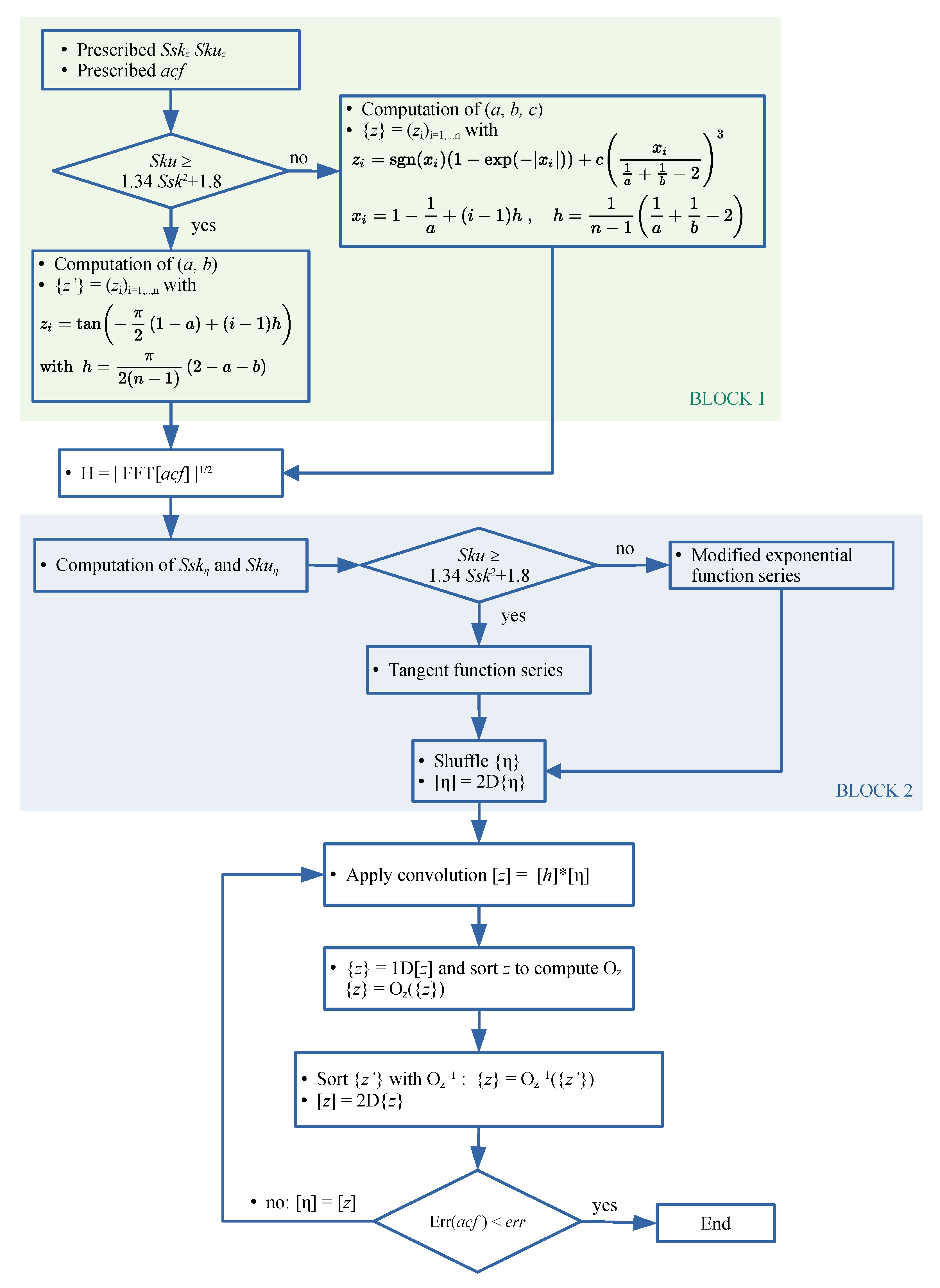 Flowchart of the modified Hu and Tonder algorithm for rough surface generation. Block 1 can be replaced by the recovery of an existing surface. Block 2 can be replaced by a prescribed texture.