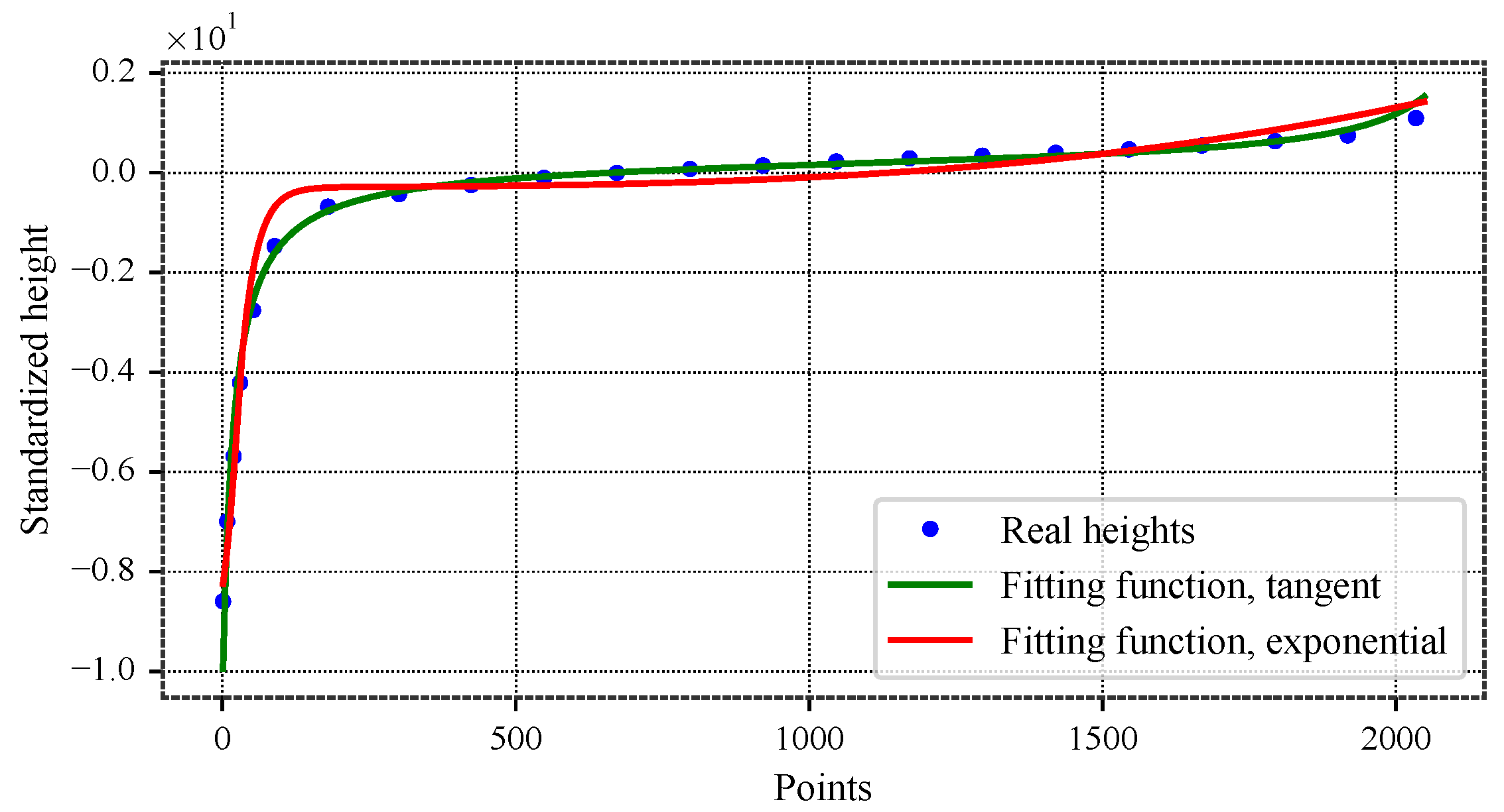 Best fit of a rotor surface material curve with tangent and modified exponential functions: and . The rotor heights were measured using a white-light interferometric microscope. From the original surface containing approximately one million points, a representative subset of about 2000 points preserving the minima and maxima was retained. The adjusted heights, on the other hand, are generated numerically.
