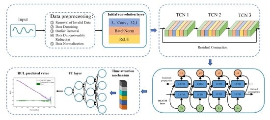 25] proposed a tool: a remaining useful life (RUL) prediction model integrated with an attention mechanism. The core lies in constructing a three-stage processing framework of ‘adaptive feature extraction—long-range dependency capture—key feature enhancement’, and the feasibility of the proposed structure was verified through experiments. Huang et al. [