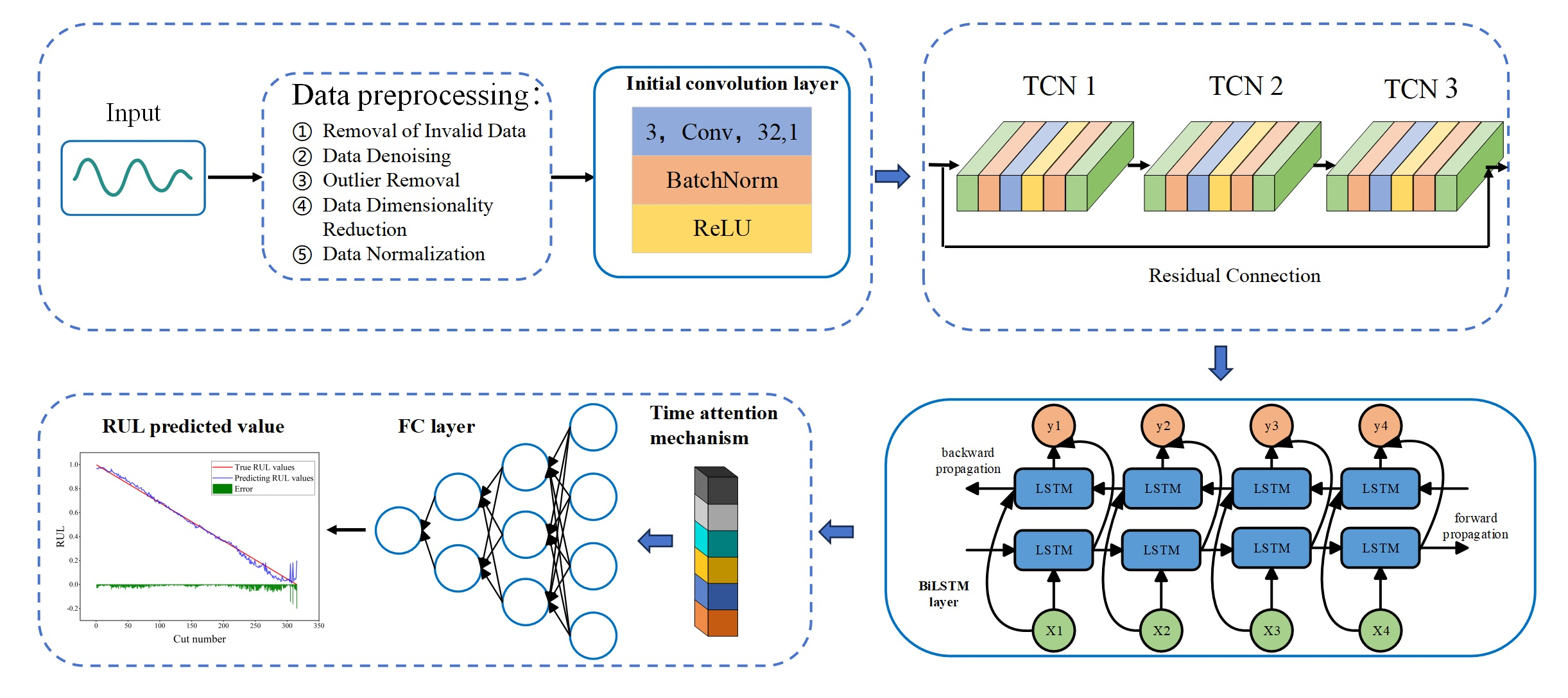 In summary, existing studies still have some limitations in tool life prediction: 1. The ability to model multi-scale time-series features is limited; 2. The capture of long-term dependencies is insufficient, and the extraction of information at critical moments is ineffective. Therefore, this paper proposes a hybrid model that integrates Temporal Convolutional Network (TCN), Bidirectional Long Short-Term Memory Network (BiLSTM), and attention mechanism—the TCN-BiLSTM-Attention model. By introducing the initial feature extraction module and the TCN network with a depthwise separable convolution structure, this model effectively improves the ability to extract locally important features. Meanwhile, dilated convolution is used to expand the receptive field, thereby enhancing the model’s ability to model long-term time-series dependent information. Further, BiLSTM is used to capture the dynamic change trends in the sequence. Finally, combined with the temporal attention mechanism, the model is guided to focus on the key time segments that have a greater impact on life prediction.