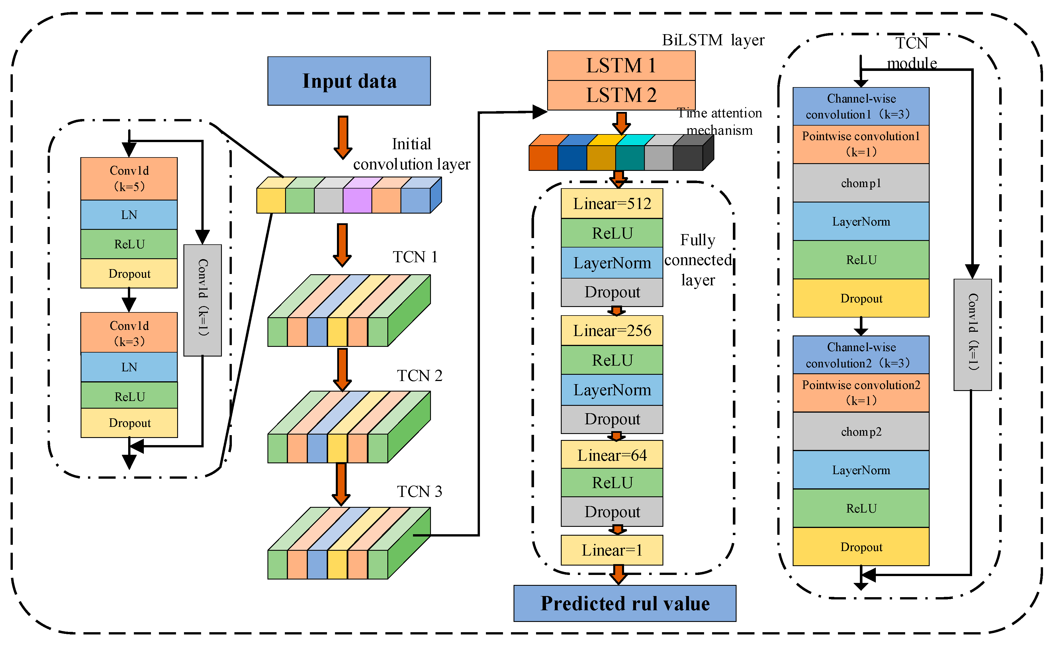 The input experimental data is first passed through the initial convolutional layer for low-level feature extraction and channel mapping. Through two layers of one-dimensional convolution operations, combined with processing methods such as LayerNorm, ReLU, and Dropout, smoother and more distinguishable local information can be extracted. Meanwhile, the residual connection structure is introduced to improve the training stability and information retention ability of the network. Then, the TCN layer further extracts local features and medium- and long-term dependencies in the input signal. The combination of causal convolution and dilated convolution can expand the receptive field while maintaining temporal consistency. The main function of the BiLSTM module is to model the bidirectional temporal dependencies in the output sequence of the TCN. Compared with the unidirectional LSTM, the bidirectional structure can simultaneously capture the context information between the current moment and its previous and subsequent states, enabling the model to more comprehensively understand the dynamic change process of the time series. The final fully connected regression module is used to map the context vector output by the attention mechanism to specific lifespan prediction values. This module adopts a multi-layer linear layer structure, combined with ReLU activation, LayerNorm, and Dropout, which enhances the model’s non-linear expression ability and anti-overfitting ability, thus ensuring that the output results still maintain high accuracy and stability under complex industrial conditions.