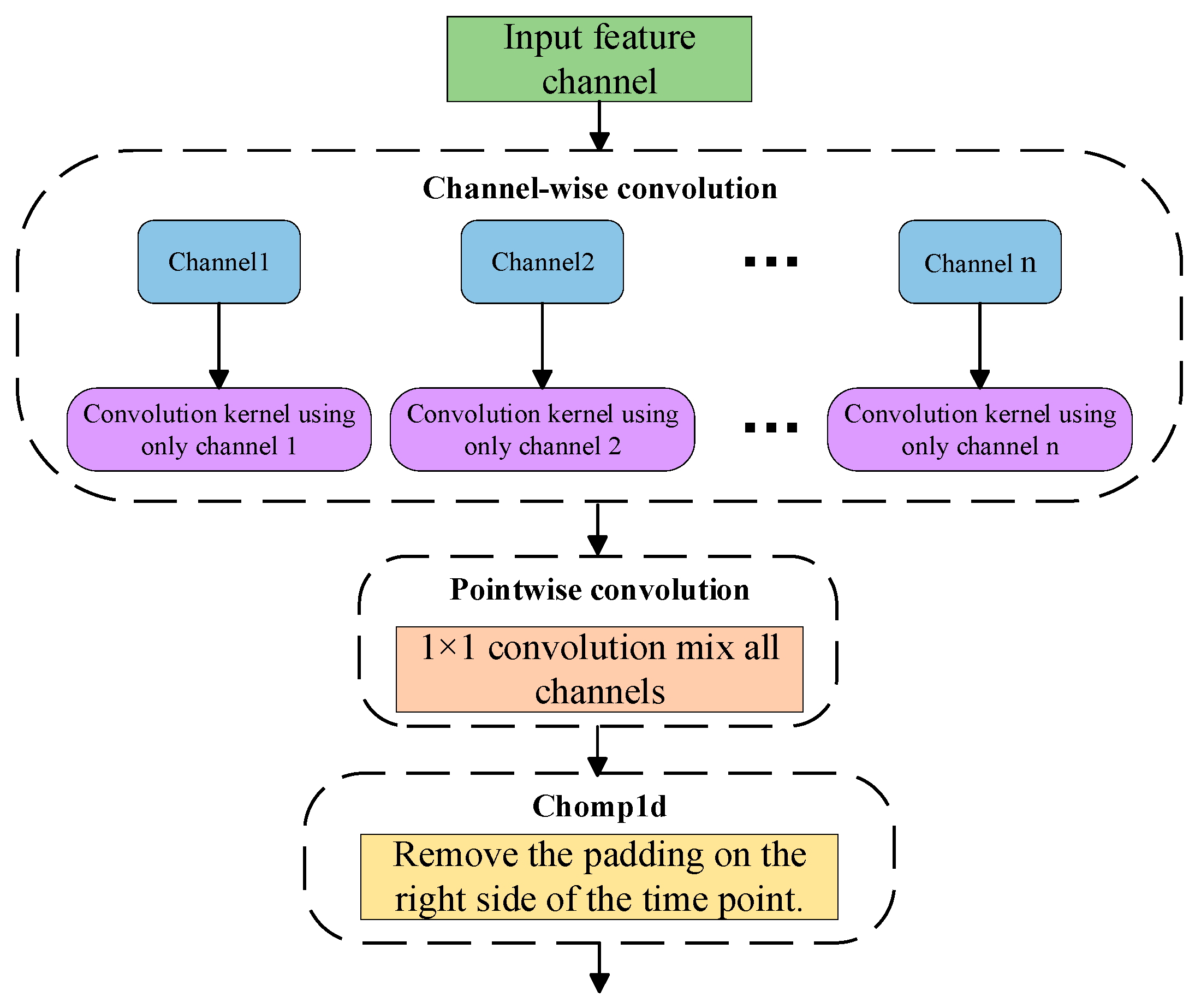 In traditional convolution, standard one-dimensional convolution jointly operates on both the temporal and channel dimensions when modeling the input sequence. Although it has strong expressive power, it also leads to high parameter redundancy and increased computational complexity. Therefore, depthwise separable convolution is introduced, which can separate the feature mapping calculations of the spatial and channel dimensions in the standard convolution operation. This significantly reduces the number of model parameters while maintaining prediction performance [