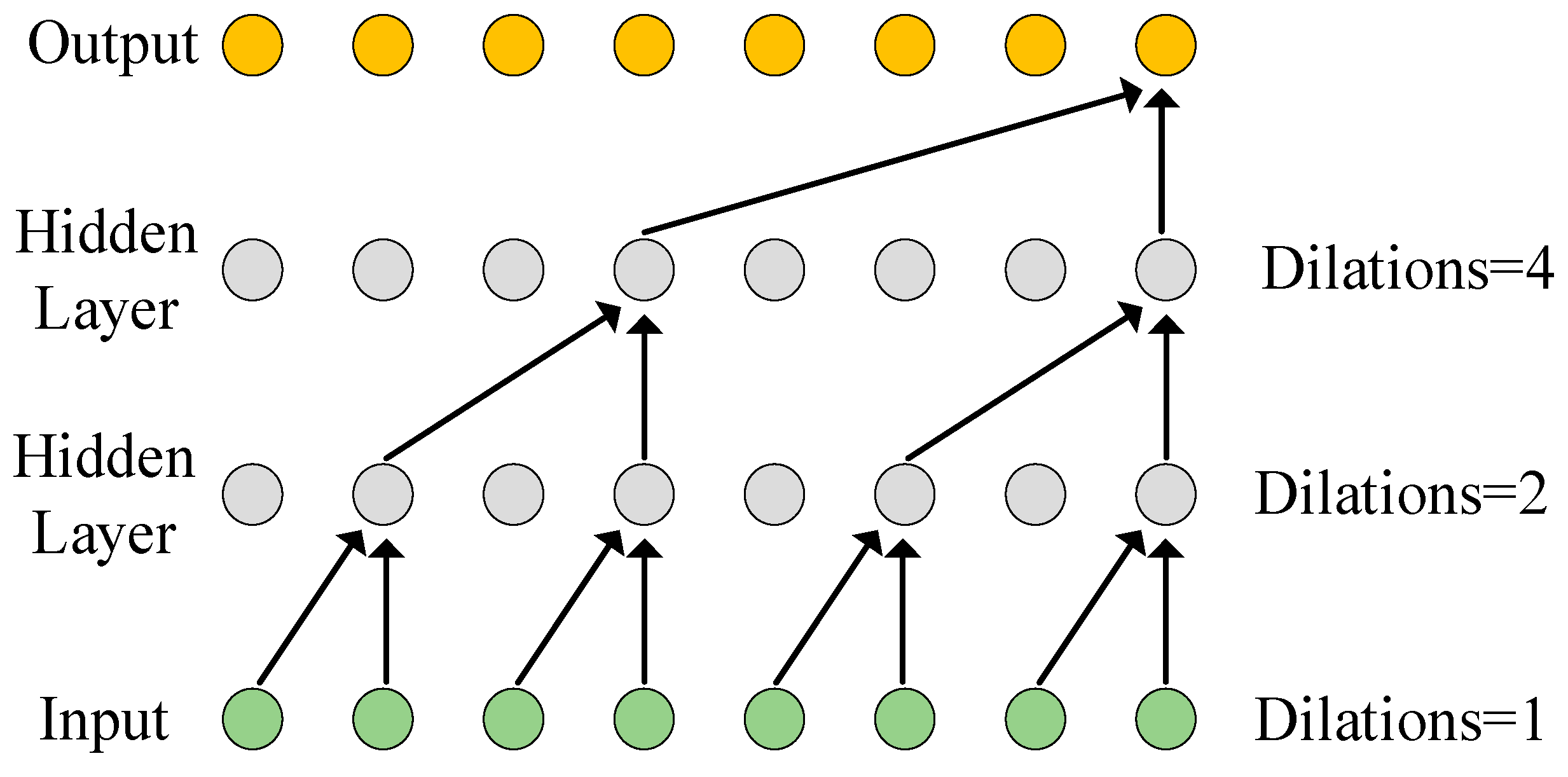 In sequential tasks, to avoid information leakage, TCN employs causal convolution to ensure that the output at each time step only depends on the data at the current time and before, rather than future values. Its structure is shown in