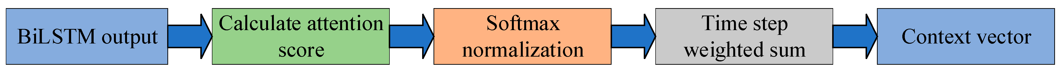 30] is introduced. This mechanism effectively improves the model’s perception of important time steps without significantly increasing the computational complexity. Its core idea is to dynamically calculate attention weights at each time step of the sequence. All time segments are evaluated through an additive scoring function, and different weights are assigned according to their relative importance. Finally, by performing a weighted sum on the output sequence of the BiLSTM, a context representation rich in global information is extracted. This process enables the model to focus more on the time periods that have a significant impact on the prediction task, thereby improving the overall modeling performance. The computational process of this mechanism is shown in