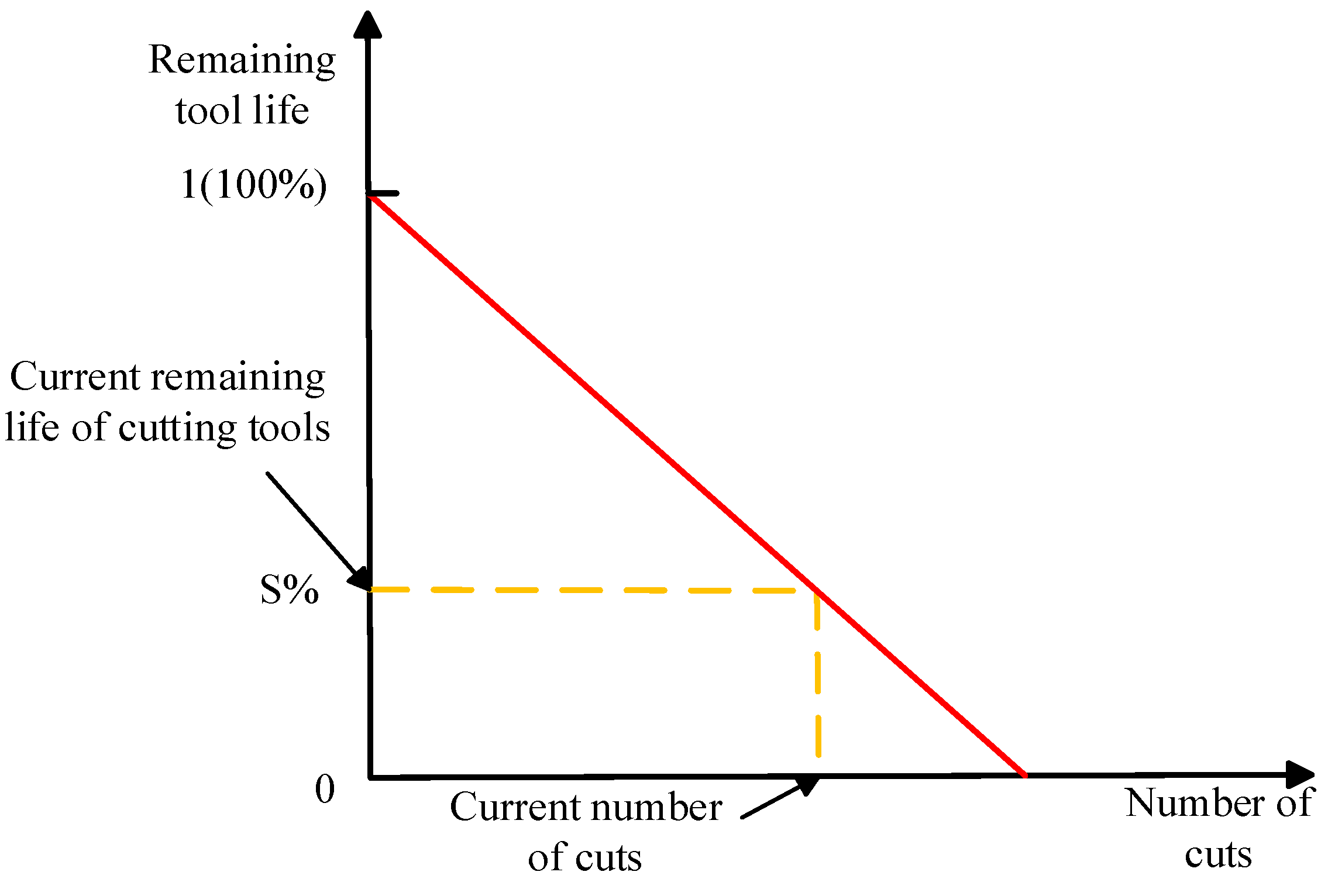The calculation method of the remaining useful life of the cutting tool is to divide the remaining useful life at the current moment by the total number of machining operations. As shown in