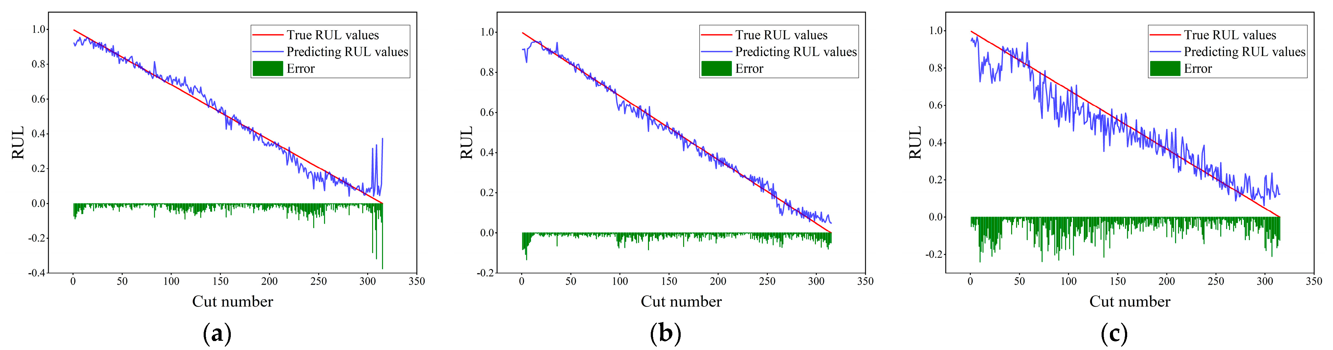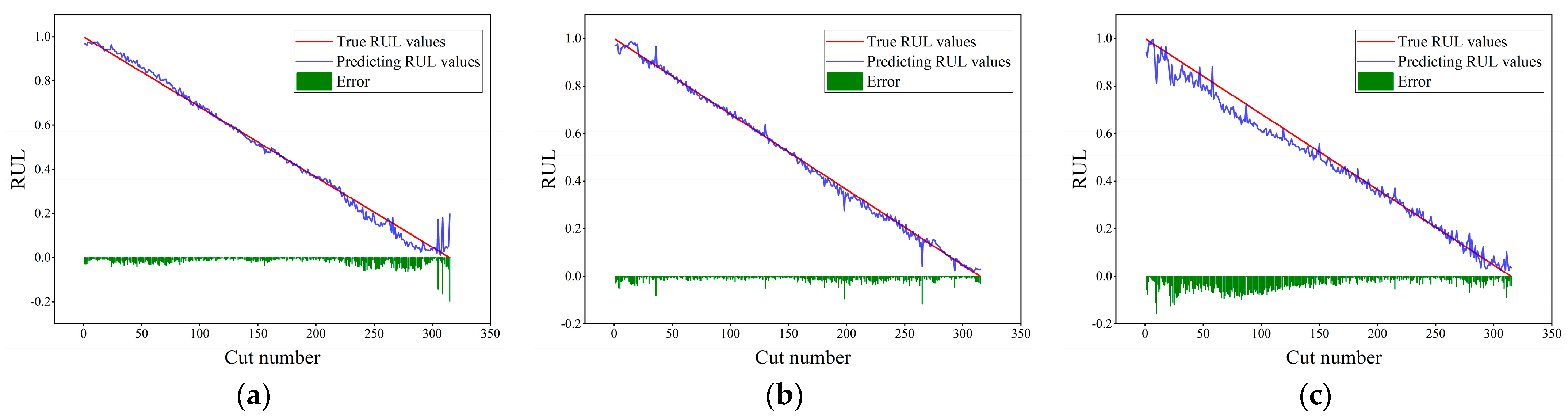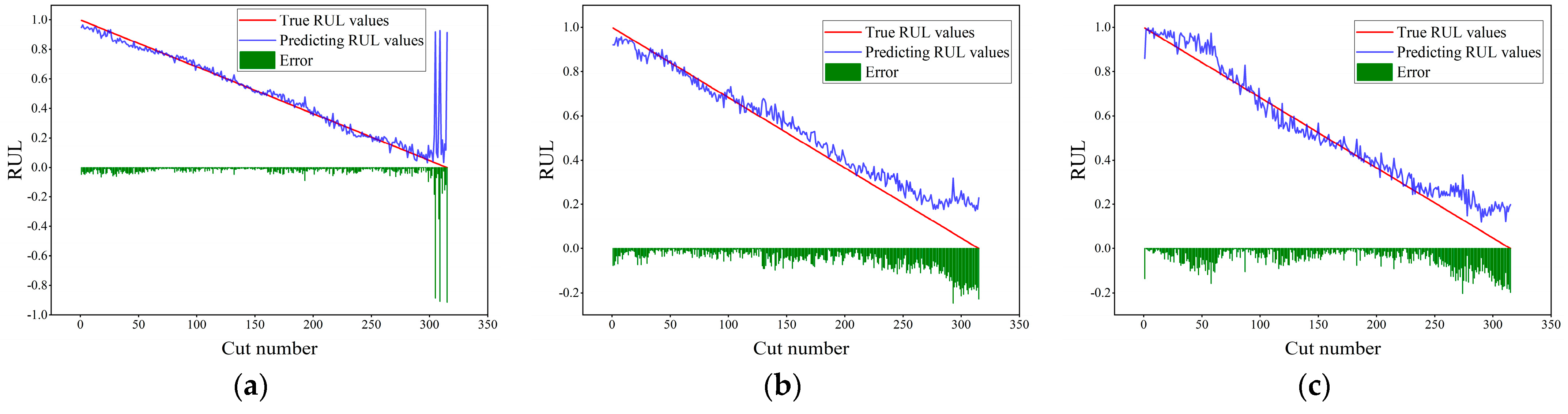 Figure 14, the abscissa represents the number of cutting cycles, the ordinate represents the RUL value, the blue line denotes the predicted RUL value, the red line denotes the true RUL value, and the green squares represent the absolute error between the two. From the prediction performances of each model on the c1, c4, and c6 datasets in