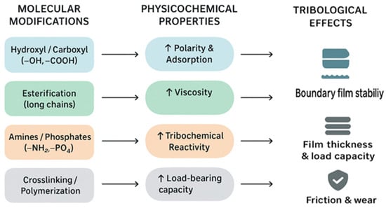 Molecular modifications directly tune the physicochemical properties and tribological performance of the lubricant. Polar groups enhance adsorption and boundary film stability, esterification increases viscosity and supports hydrodynamic films, reactive moieties such as amines and phosphates promote tribochemical protection, and crosslinking increases load-bearing capacity []. Collectively, these relationships provide a molecular-level rationale for balancing friction reduction, wear protection, and film formation. To illustrate these relationships, Figure 4 represents how specific molecular modifications translate into changes in physicochemical properties and ultimately tribological effects. This schematic highlights the direct links between chemical design, lubricant behaviour, and performance in the service.
