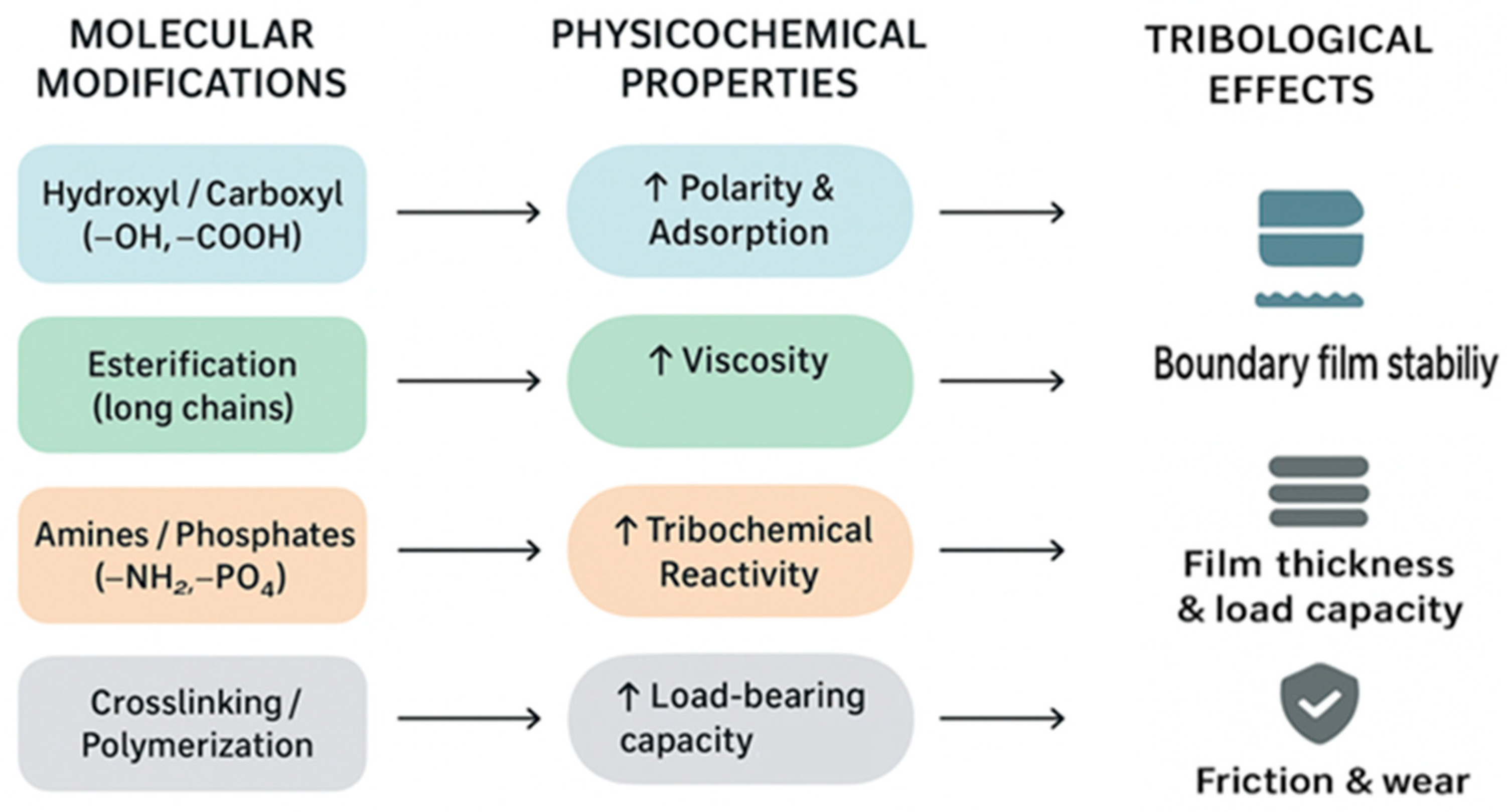 - Structure–property correlation: Polar functionalities (–OH, –NH2, –PO4) improve boundary lubrication and wear resistance, whereas esterification and long-chain modifications enhance viscosity index (VI) and oxidative stability.