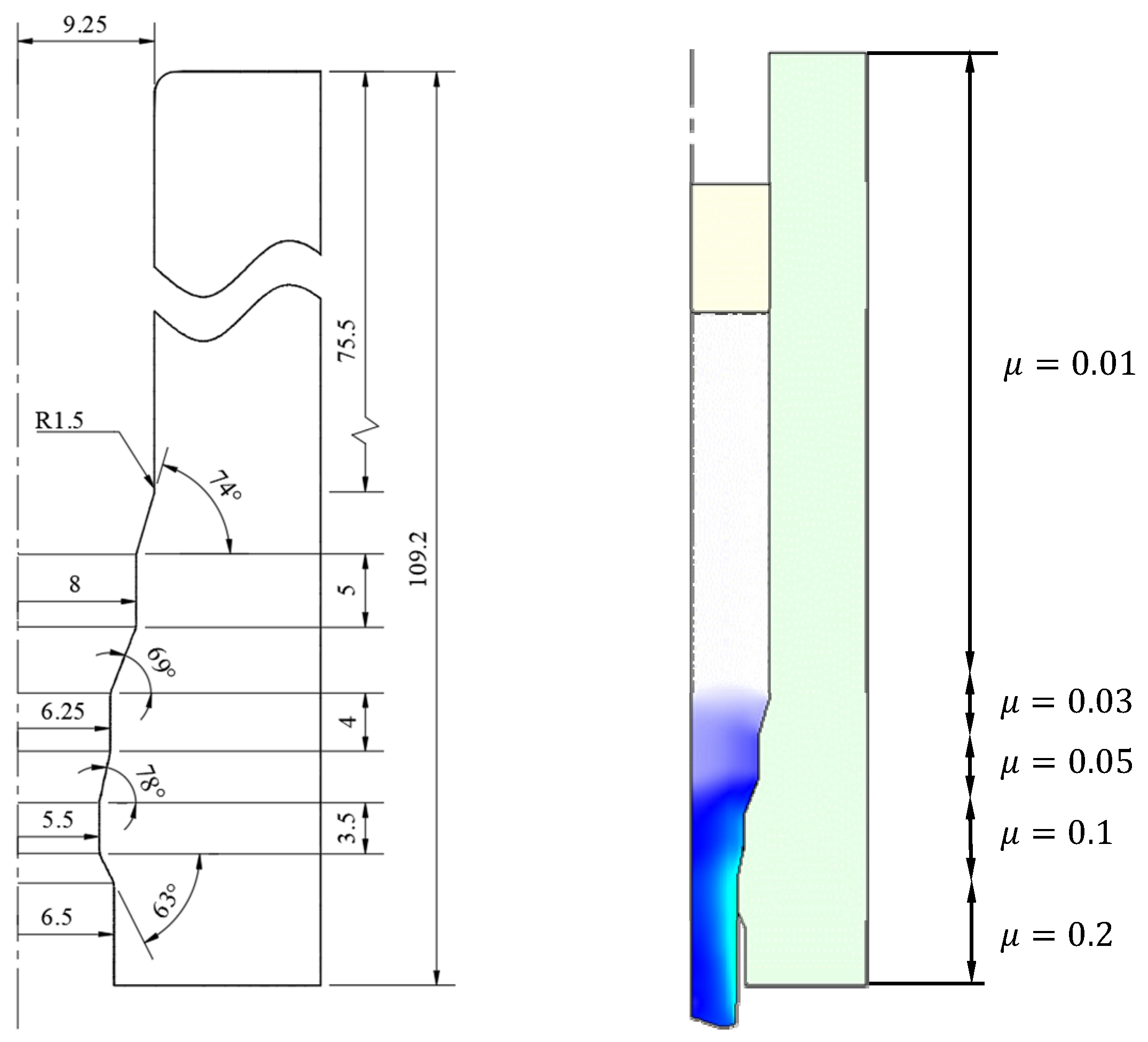 - Complementary or non-standard ring compression test: Since a pressure higher than the flow stress is applied in ring compression testing, there are limitations in evaluating the friction state of exceptional processes (e.g., forward extrusion with low extrusion ratio) where experiments are conducted at a pressure lower than this. Petersen et al. [9] used a new complementary ring-test geometry to reduce the increase in ring compression load due to barreling. In this model, normal stresses over some areas of the material–die interface are lower than the material’s flow stress. They used inverse analysis technology to identify the friction condition shown in Figure 2, focusing on the GFL. Sanodiya and Choudhary [96] identified friction from the compression tests of non-standard (or differently shaped) specimens that can replace standard ring compression test specimens. It was confirmed that the results obtained from the non-standard specimens were similar to those obtained from the existing specimens.