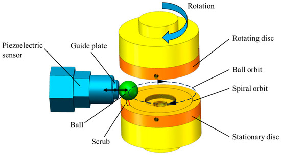 In Equations (1) and (2), is the sliding friction force exerted by the rotating disc on the ball, measured in N; is the radial force exerted by the stationary disc on the ball, measured in N; is the measured value from the piezoelectric force sensor, measured in N; is the radius of the ball.
