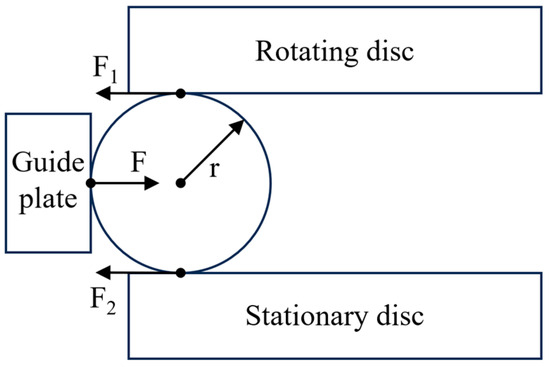 The measurement of the coefficient of friction is based on the unique mechanical design of the spiral orbit tribometer. When the loaded steel ball enters the scrubbing zone and collides with the guide disc, it undergoes macroscopic radial sliding at the point of contact with the rotating disc, thereby generating a radial sliding friction force [30]. To counterbalance the torque generated by this friction force, the stationary disc must apply an equal and opposite radial force to the ball, as shown in Figure 2.