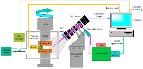 The operating principle of the in situ monitoring module is illustrated in Figure 3. As the rotating disc turns, the steel ball follows a spiral trajectory. Upon colliding with the guide plate equipped with piezoelectric sensors, the ball returns to its original path. During this process, the piezoelectric sensors continuously capture friction force signals generated by the collision and transmit them to a computer for acquisition and processing. Simultaneously, an optical microscope is aligned with the stationary disc’s surface through the vacuum chamber’s observation window. A displacement stage enables fine adjustment and precise focusing of the microscope. The computer enables real-time observation of friction trajectories and wear morphology on the stationary disc’s surface. For Raman spectroscopy monitoring, the laser light passes through the excitation path and is introduced into the vacuum chamber via the observation window, focused onto the stationary disc’s surface. The resulting Raman-scattered light is collected and directed back through the same optical path to the spectrometer for analysis. The generated spectra are then displayed and processed on the computer. Additionally, the system continuously extracts residual gases from the chamber via a vacuum pump and directs them into a gas analyzer. Analysis results are displayed on the computer, enabling online monitoring and analysis of volatiles and gas composition.