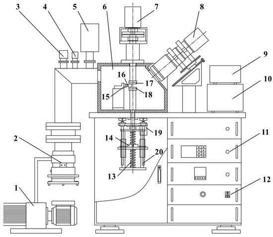 The main structure of the simulation system with integrated in situ monitoring capabilities is shown in Figure 4. The lubrication state of the CMG bearing rolling element under vacuum conditions differs significantly from that in atmospheric-pressure ground environments. To more accurately simulate the operational environment of the CMG bearing rolling element in space, this system must possess the capability to maintain a high-vacuum environment. Therefore, the system’s vacuum module employs a series configuration of a mechanical pump and a molecular pump to evacuate the vacuum chamber, thereby simulating a high-vacuum environment. This module primarily includes the vacuum chamber, the mechanical pump, the molecular pump, an ionization vacuum gauge, a resistance vacuum gauge, along with piping, valves, and auxiliary connection mechanisms. During formal experiments, the manual air valve in the vacuum chamber is first closed to ensure the chamber is sealed. Subsequently, the mechanical pump is activated to evacuate gases from the chamber through the piping. When the resistance vacuum gauge indicates a pressure below 15 Pa, the molecular pump is initiated to further enhance the vacuum level. At this stage, the system’s vacuum degree can be monitored and recorded in real-time via the ionization vacuum gauge. Table 1 lists the primary equipment parameters of the vacuum module.