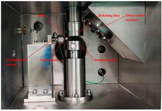 The vacuum and motion simulation module employs a stationary disc, a rotating disc, and a lubricated steel ball that rolls and pivots between them to simulate the motion and lubrication conditions of a bearing rolling element, as shown in Figure 1. Its operating principle is as follows: First, a load is applied to the stationary disc, positioning the lubricated steel ball between the rotating and stationary discs. Next, the rotating disc is driven at a specific speed, causing the steel ball to undergo both rotation and revolution, thereby simulating the contact motion state of a rolling element within a bearing. Simultaneously, the centrifugal force generated by the revolution causes the steel ball to follow a spiral trajectory. To prevent the steel ball from being ejected from the stationary disc, a guide plate is installed on the outer side of the stationary disc. Collisions between the steel ball and the guide plate redirect the ball back onto its intended orbital path [29].