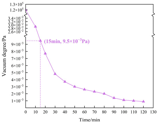 To accurately simulate the actual operating conditions of bearing rolling elements in a vacuum environment, it is necessary to verify the vacuum performance of the system. The system employs mechanical pumps and molecular pumps to evacuate the vacuum chamber, utilizing a resistive ionization vacuum gauge to monitor real-time pressure changes within the chamber. Test results are shown in Figure 6. The system demonstrated excellent pumping efficiency and stability, rapidly achieving a vacuum level of 9.5 × 10−3 Pa within 15 min of startup. Within one hour, it reached a high-vacuum operating state of 2.6 × 10−3 Pa and maintained stability at the 10−3 Pa level for the subsequent hour. These results demonstrate that the system possesses an excellent vacuum maintenance capability. It effectively simulates extreme high-vacuum conditions in space, meeting the vacuum environment requirements for space bearing testing.