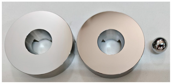 The test specimens consisted of a rotating disc, a stationary disc, a steel ball, and PAO4 lubricant; the configurations of these components are shown in Figure 8. Both discs, made of 304 stainless steel, had an outer diameter of 50.8 mm and an inner diameter of 20 mm, while the steel ball had a diameter of 12.7 mm. The rotating and stationary discs were mounted on the upper and lower specimen holders, respectively. The steel ball, coated with a layer of PAO4 lubricant, was placed between them. The test parameters were set to 25 °C, an applied load of 100 N, and a rotational speed of 100 r/min. As the gas analyzer requires a vacuum level within 10−3 Pa or better to detect residual gases, the chamber was evacuated until this pressure was reached before activating the motion simulation and in situ monitoring modules.