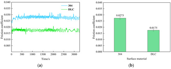 To ensure the reliability of this system in CMG bearing material research, a differentiation verification must be conducted to assess its capability to distinguish between samples with different surface materials. The experiment selected two sets of test discs with surface materials of 304 stainless steel and diamond-like carbon (DLC) as research subjects. Conducted at room temperature (25 °C), the test employed a loading force of 200 N and a rotational speed of 200 r/min. A steel ball coated with PAO4 lubricant was placed between the rotating disc and the stationary disc. The experiment was then initiated to collect friction force and friction coefficient data.