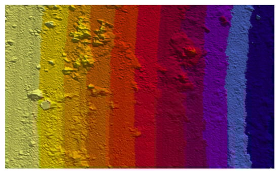 According to the distribution range of RGB values, the range corresponding to color block No. 1 was first determined. The original image (e.g., Figure 12) was then scanned using the PIL module, and pixels that matched the RGB distribution range of this color block were identified. These pixels were converted to black (R = 0, G = 0, B = 0) for testing, as shown in Figure 14. While most pixels of color block No. 1 were correctly extracted, some remained undetected. To address this, the RGB range of adjacent colors was extracted and subtracted from that of the target color, thereby supplementing the missing pixels until the worn surface morphology appeared as shown in Figure 15. Once the RGB range of a color block could accurately capture all corresponding pixels, the process was terminated. The same procedure was applied to the remaining color blocks, with the finalized RGB values summarized in Table 5.
