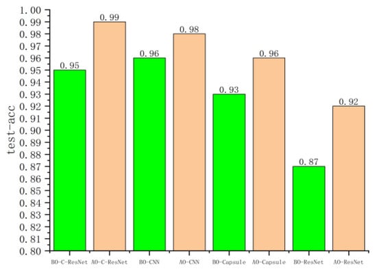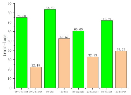 Based on the BO and AO image datasets, four models—CNN–ResNet, CNN, CapsNet, and ResNet—were trained and evaluated, with the validation set used for performance verification. Figure 16, Figure 17, Figure 18 and Figure 19 present the loss and accuracy values for both the training and validation sets. When using the AO dataset, all models achieved significant improvements compared with the BO dataset. For the training set, the loss values of CNN–ResNet, CNN, CapsNet, and ResNet decreased by 3.67, 13.31, 1.52, and 4.83, respectively, while recognition accuracy increased by 4%, 2%, 3%, and 5%. For the validation set, the loss values of the four models were reduced by 56.69, 30.97, 27.72, and 32.45, with accuracy improvements of 34%, 21%, 28%, and 25%, respectively.