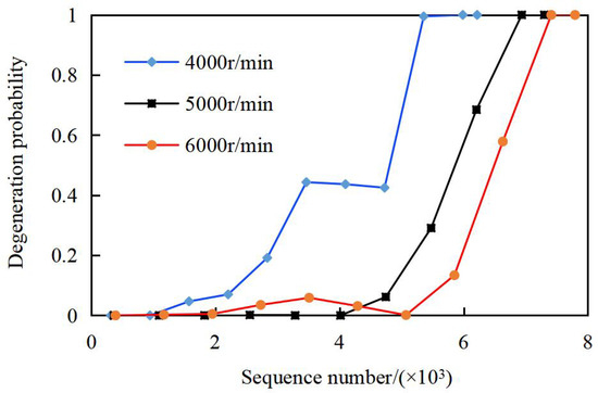 - Higher speeds delay the onset of non-zero degradation: At 6000 r/min, the probability remains near zero until the 3rd sequence; at 4000 r/min, this occurs at the 2nd sequence.