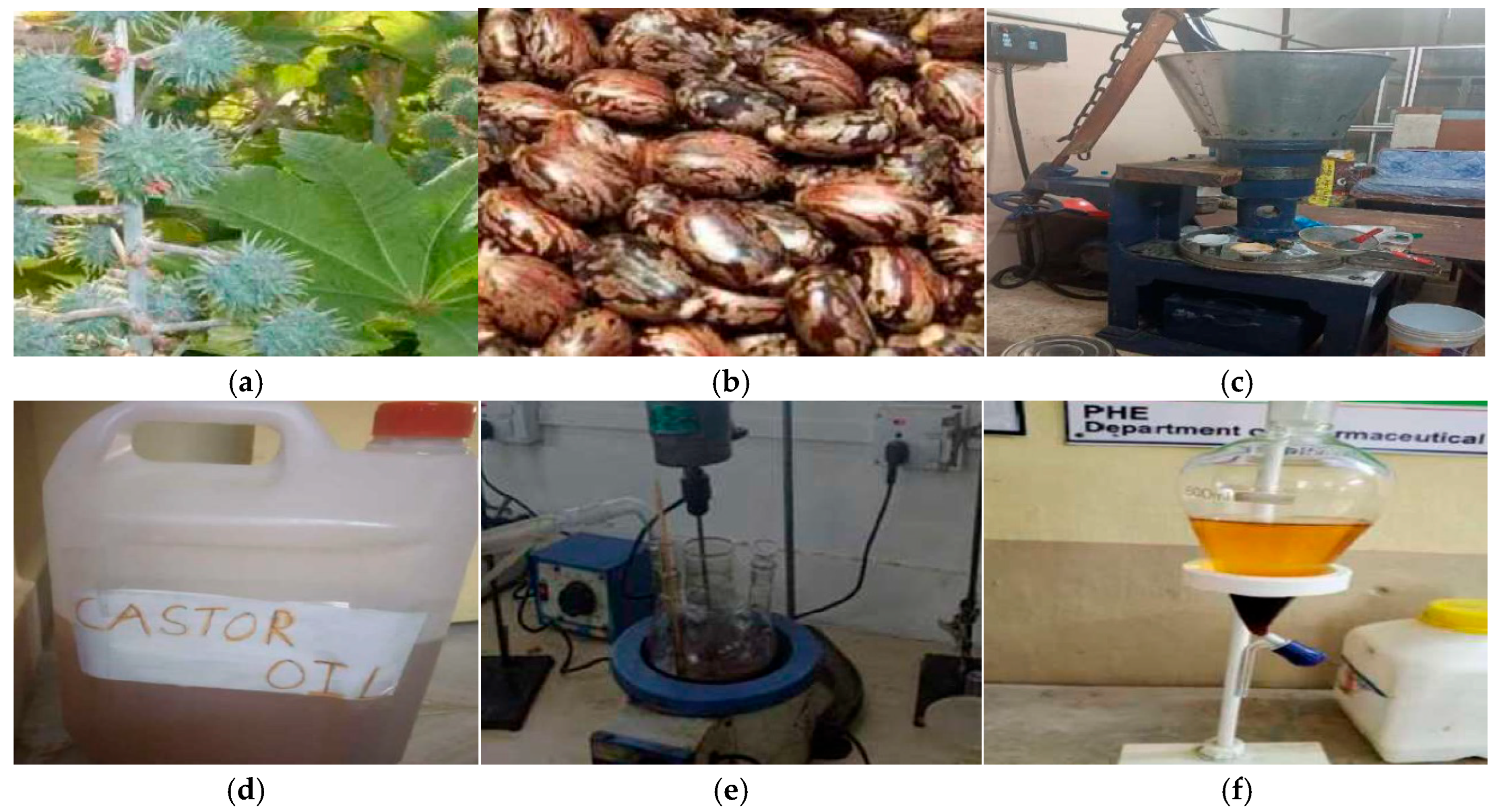 - Patel, S.; Sharma, R. Improved cold flow and oxidation stability of modified castor oil. J. Clean. Prod. 2022, 363, 132544. [Google Scholar]