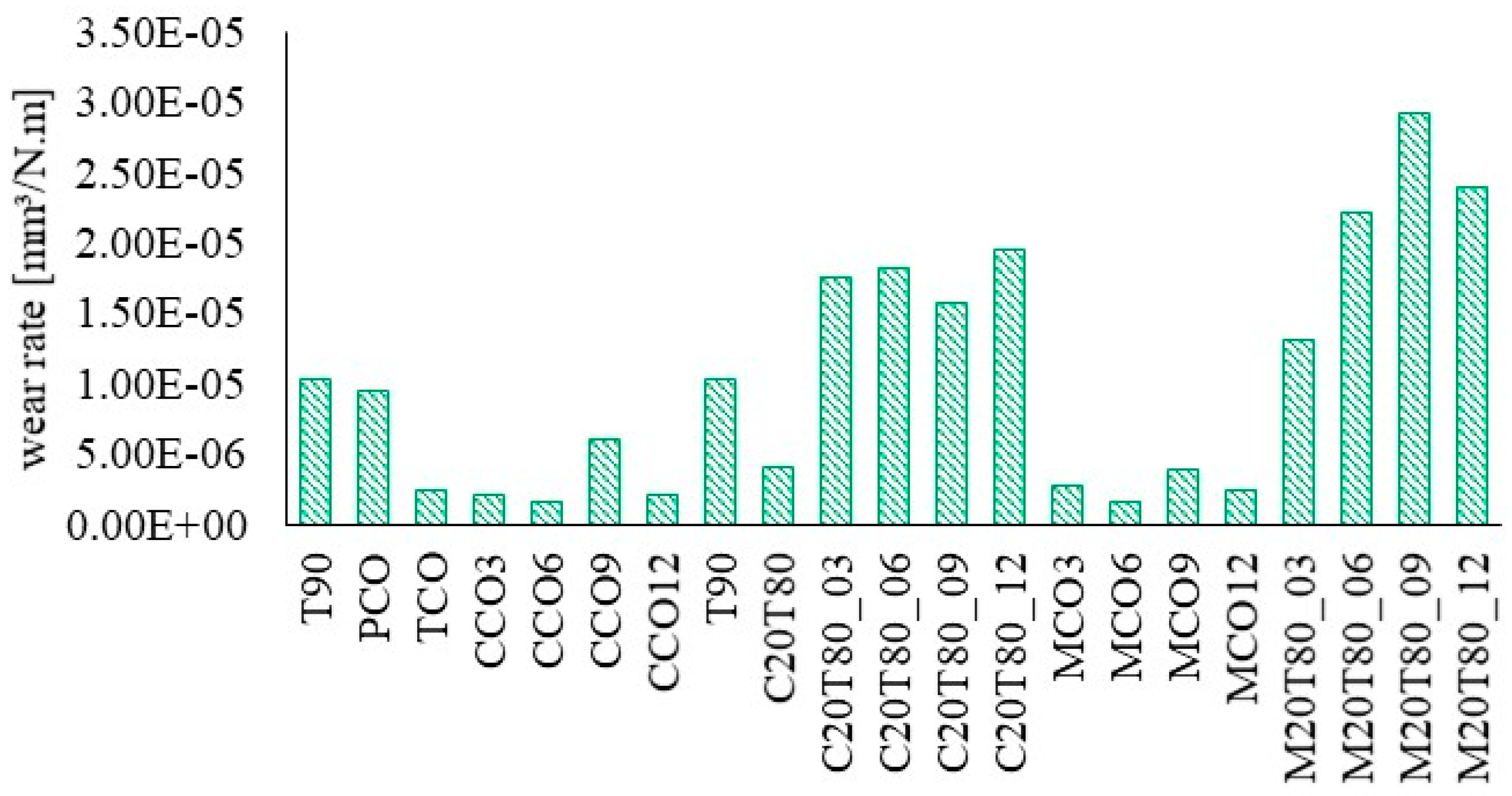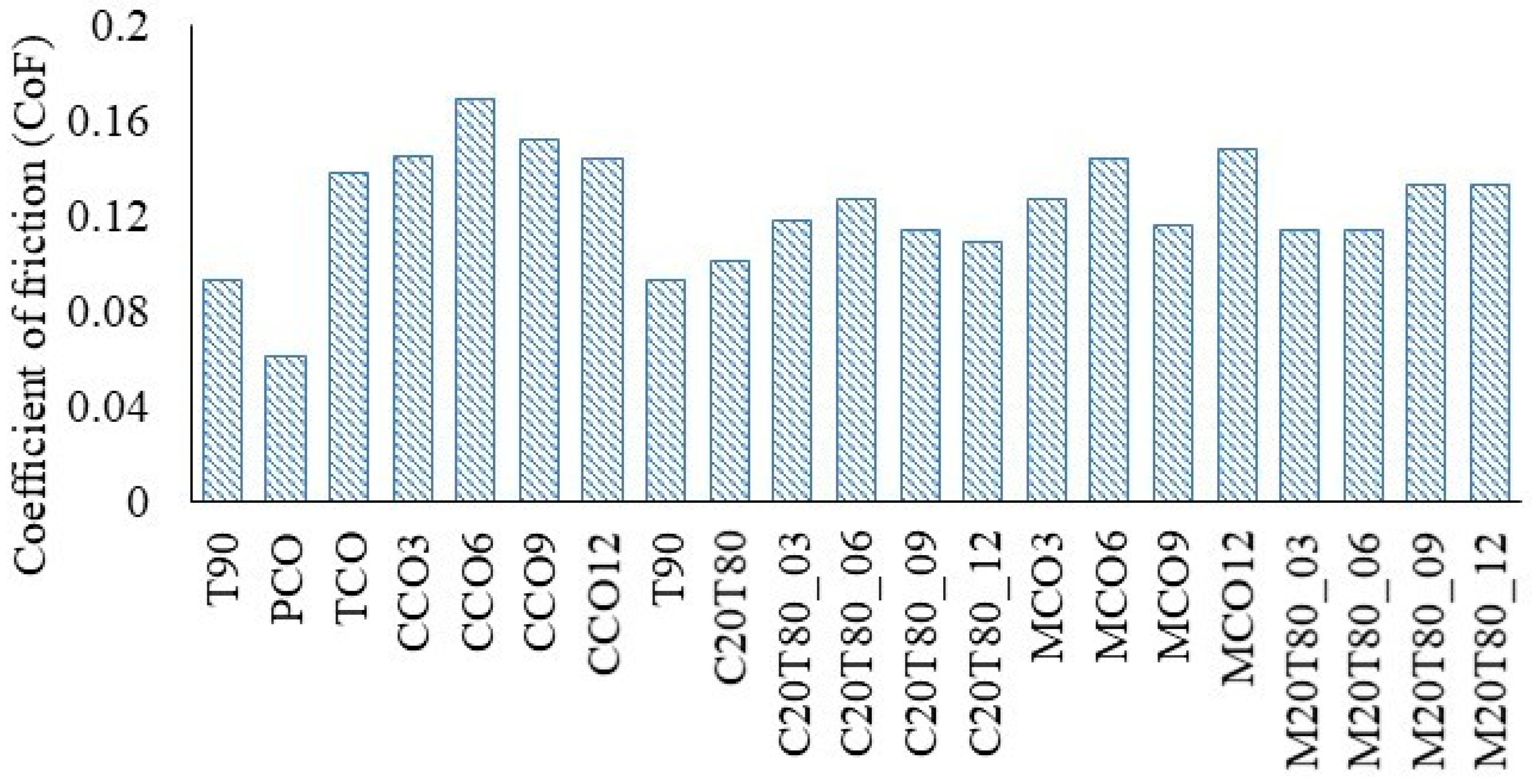 - Ternary blends (C20T80 and M20T80) exhibited moderate frictional performance but significantly higher wear rates (up to 2.92 × 10−5 mm3/N·m), indicating that base oil dilution enhances dispersion but compromises tribo-film stability.