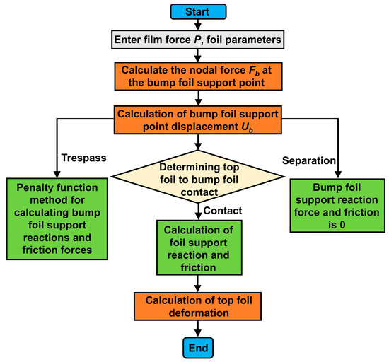To achieve an effective solution to foil deformation and friction contact, the solid mechanics beam model elements are used. The plane beam element model, the foil beam modeling, and the top foil beam model forces analysis are presented in Appendix A. The negative pressure in the top foil beam model may be caused by the bending of the foil and the film effect. Contact state evaluations are necessary for beam model-based foil displacement calculations. The film pressure acting on the top foil is discretized into nodal forces at the bump support positions, which govern the determination of contact states. When the film force opposes and exceeds the preloading force, the foils are considered separated, resulting in zero support and friction forces. The gas film force must be positive and below the maximum reaction force of the bump foil for persistent foil contact. Support and friction forces are determined from the normal displacement of the bump foil. A penalty function method is used to calculate the resulting support and friction forces. The top foil displacement is then obtained according to the contact states. The procedure is illustrated in Figure 2.
