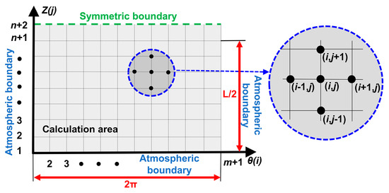 The difference method is used to solve the Reynolds equation. The details of the difference and solution of the Reynolds equation are shown in Appendix B. The following provides a comprehensive explanation of the solution area. The inner surface of the bearing (the inner surface of the top foil) is unwrapped circumferentially into a rectangular domain, upon which a coordinate system is established for finite difference mesh discretization, as illustrated in Figure 3. The θ-axis represents the circumferential direction. At the same time, the z-axis denotes the axial direction. The entire circumferential domain is uniformly divided into m elements, with the corresponding node indices denoted by i. Similarly, half of the axial extent is evenly divided into n elements, with node indices represented by j. The foil is exposed to the atmosphere on both sides and features significant gaps at the leading and trailing edges. The nodes located along the lateral and end boundaries are defined as atmospheric boundaries and are excluded from the computational domain.