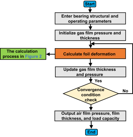 Foil deformation and friction must be considered. When the rotor operates in the rotational speed range considered in this study, a dynamic pressure film forms between the journal and the top foil. This film force acts on the top foil. Contact between the top and bump foils compresses and deforms the foils. During stable operation, the film force and the reaction force from foil displacement are in a dynamic equilibrium. This section will delineate the computational workflow. Figure 4 shows the calculation process for CEA.