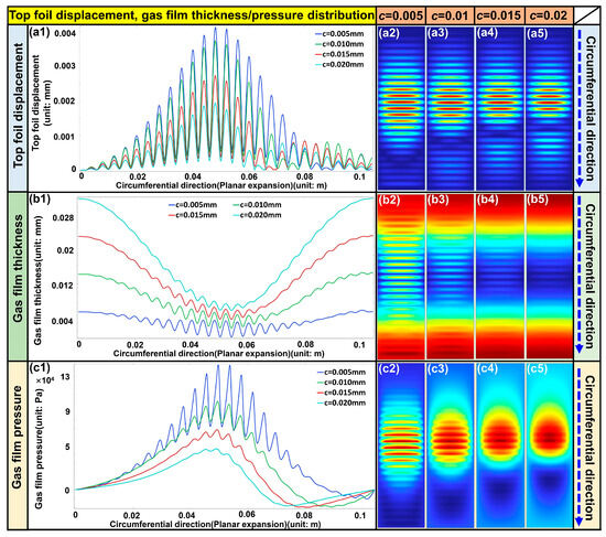 Simulation results under different clearances: (a1) the top foil displacement distribution, (a2–a5) cloud graph; (b1) the gas film thickness distribution, (b2–b5) gas film thickness cloud graph; (c1) the gas film pressure distribution, (c2–c5) gas film pressure cloud graph, respectively.