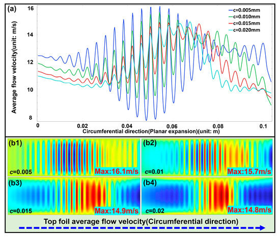 Simulation results under different clearances: (a) average gas velocity variation on the top foil, (b1–b4) cloud graph of average gas velocity variation on the top foil.