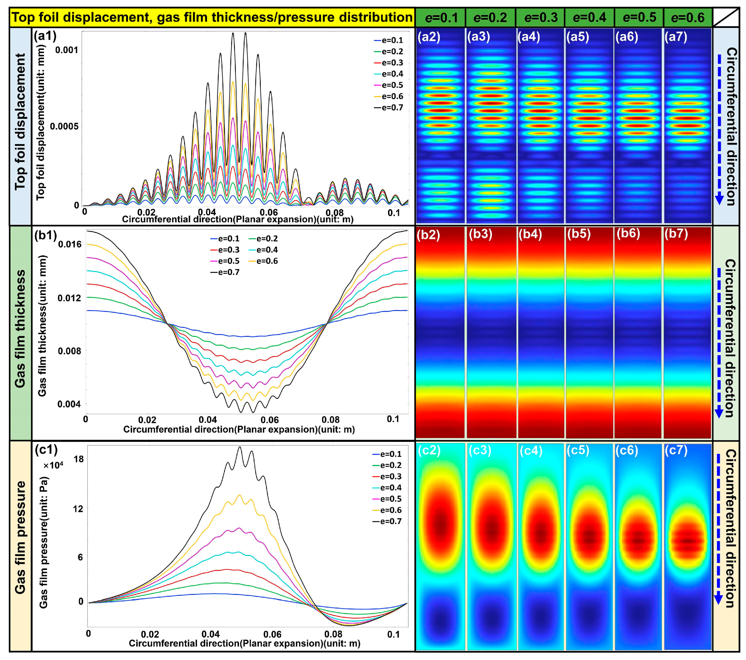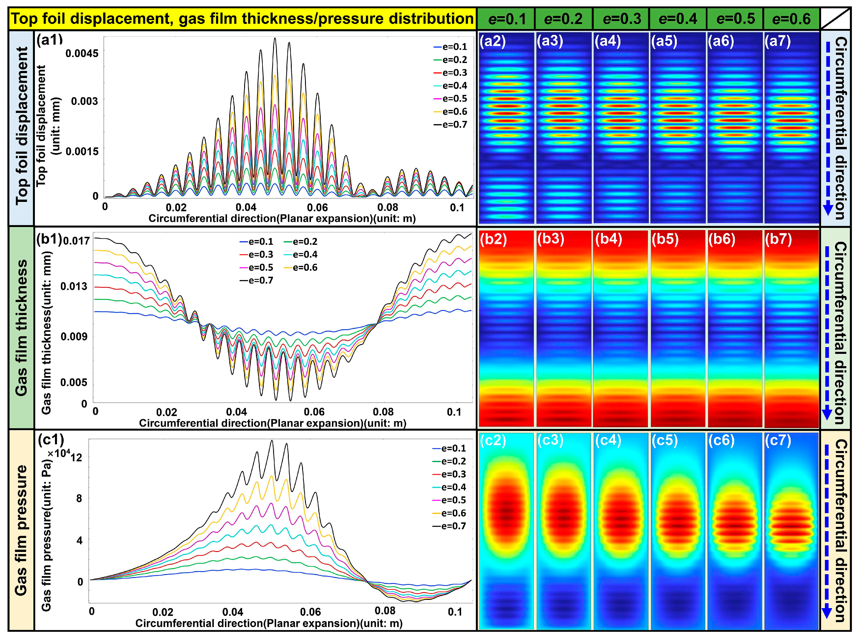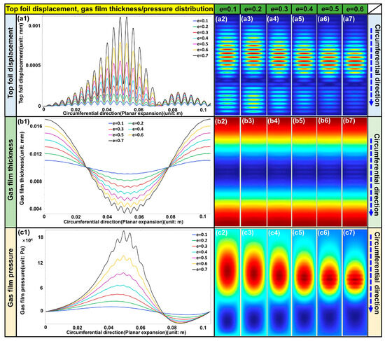 Simulation results under different eccentricities: (a1) the top foil displacement distribution, (a2–a7) top foil cloud graph; (b1) the gas film thickness distribution, (b2–b7) film thickness cloud graph; (c1) the gas film pressure distribution, (c2–c7) gas film pressure cloud graph, respectively.