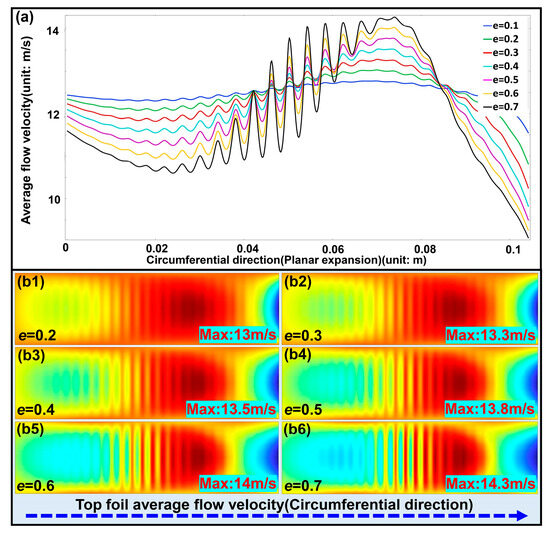 Simulation results under different eccentricities: (a) average gas velocity variation on the top foil, (b1–b6) cloud graph of average gas velocity variation on the top foil.