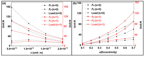 From Figure 8a, when the eccentricity e = 0.1, the maximum top foil displacement is about 0.0004 mm, whereas at e = 0.7, it increases markedly to 0.00488 mm. The displacement grows with increasing eccentricity, and the effect becomes particularly pronounced under conditions of large eccentricity. As shown in Figure 8b, when e = 0.1, the film thickness varies smoothly between 0.009 mm and 0.011 mm. However, at e = 0.7, severe oscillations occur, with the maximum film thickness reaching 0.0174 mm and the minimum reducing to 0.00313 mm. Figure 8c demonstrates that for e = 0.7, the peak pressure reaches 1.36 × 105 Pa, and the pressure fluctuation amplitude increases significantly, especially in regions of reduced film thickness where pressure concentration is evident.