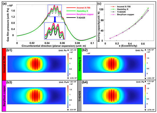 This part presents the results and systematically examines the influence of parameters and materials on film pressure, deformation, and capacity, with comparisons to theoretical predictions. To investigate load capacity and stability, this study calculates film pressure and bearing capacity, using top-foil displacement, film thickness distribution uniformity, and pressure fluctuations as indicators of stability.