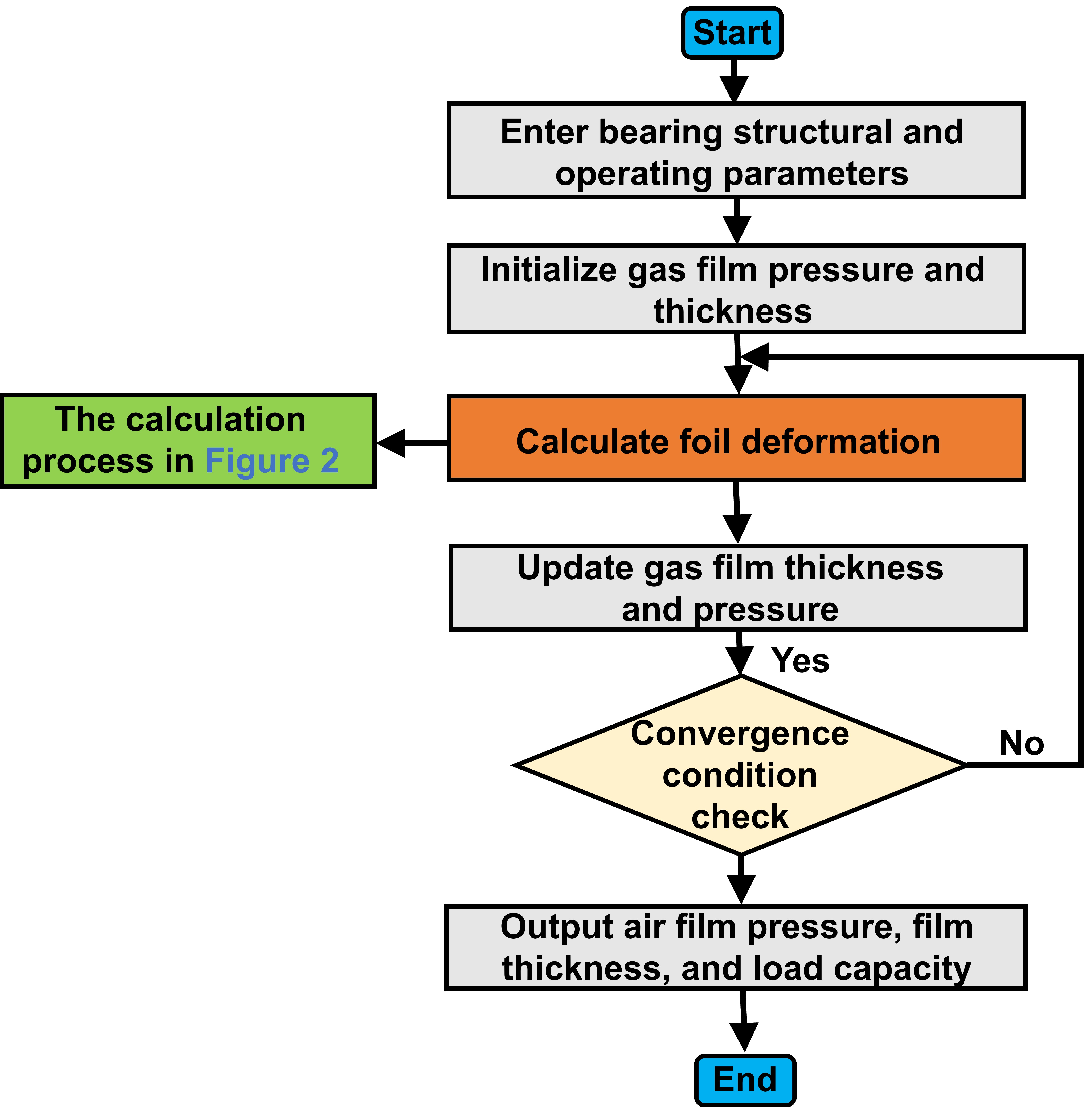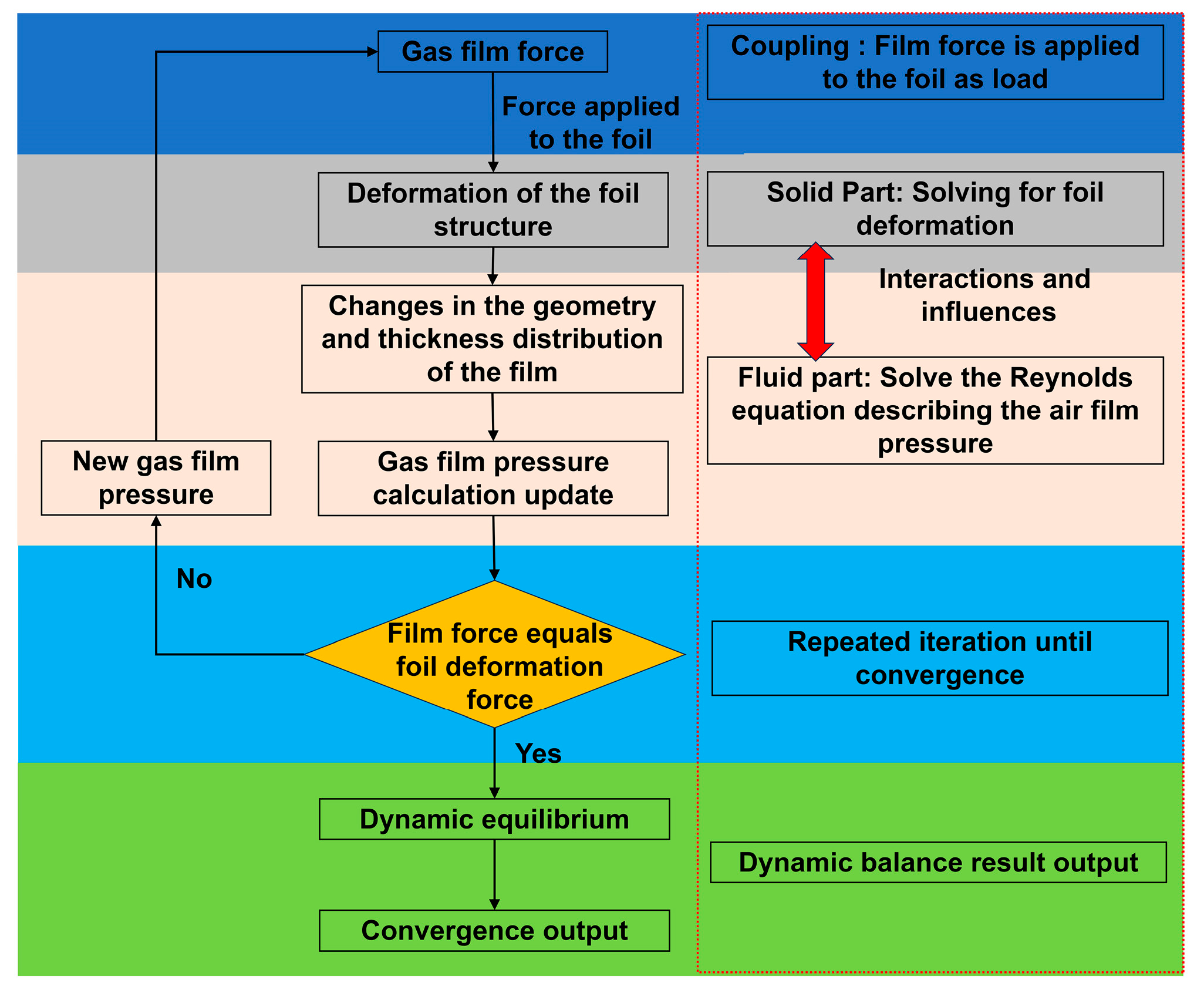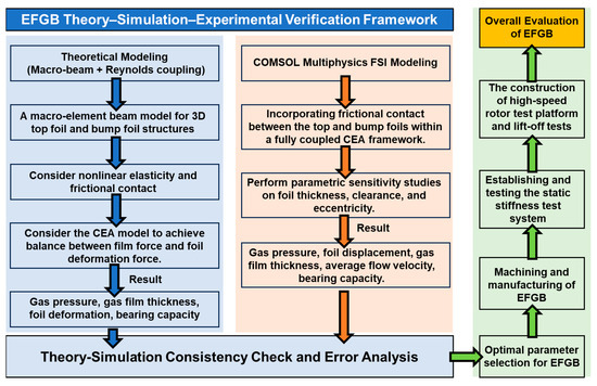 This study is guided by the following questions: (1) How can a CEA framework be developed to capture the nonlinear interaction between pressure and foil deformation while maintaining computational efficiency for design-oriented parametric studies of EFGBs? (2) How do geometric and operating parameters—foil thickness, clearance, and eccentricity–jointly affect gas film pressure distribution, foil displacement, film thickness fluctuation, and load capacity, and what trade-offs do they present between stiffness and stability? (3) To what extent can predictions from the CEA framework and the 3D multiphysics model be validated against experimental measurements of a prototype EFGB with the same geometric parameters and target load? Based on the analyses, this study advances the following hypotheses: (H1) A macro-element beam-Reynolds CEA model, validated against a 3D FSI model incorporating realistic foil geometry, nonlinear elasticity, and frictional contact, can predict the static performance of EFGBs (pressure distribution, film thickness, and load capacity) with sufficient accuracy for engineering design. (H2) Increasing foil thickness within a practical range enhances system stiffness, increases peak gas film pressure, and reduces excessive film thickness and pressure fluctuations, improving load capacity and static stability compared to thinner foils. (H3) Reducing radial clearance and increasing eccentricity strengthen the hydrodynamic effect and improve load capacity, but also amplify CEA-induced oscillations and frictional effects; thus, an optimal combination of foil thickness, clearance, and eccentricity is required to balance capacity and stability for a given design load. These hypotheses are examined through a unified Theory–Simulation–Experimental Verification approach.