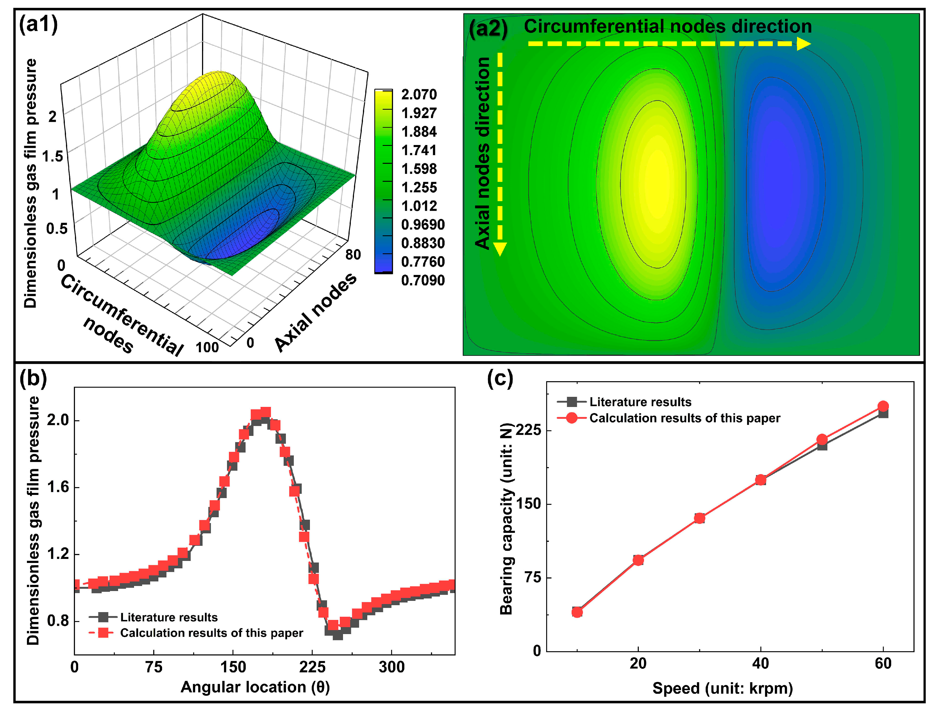 Figure 18b, the dimensionless gas film pressure results confirm the model’s ability to capture pressure concentration and distribution, with an error small compared with the maximum gas film pressure of 1.36 × 10