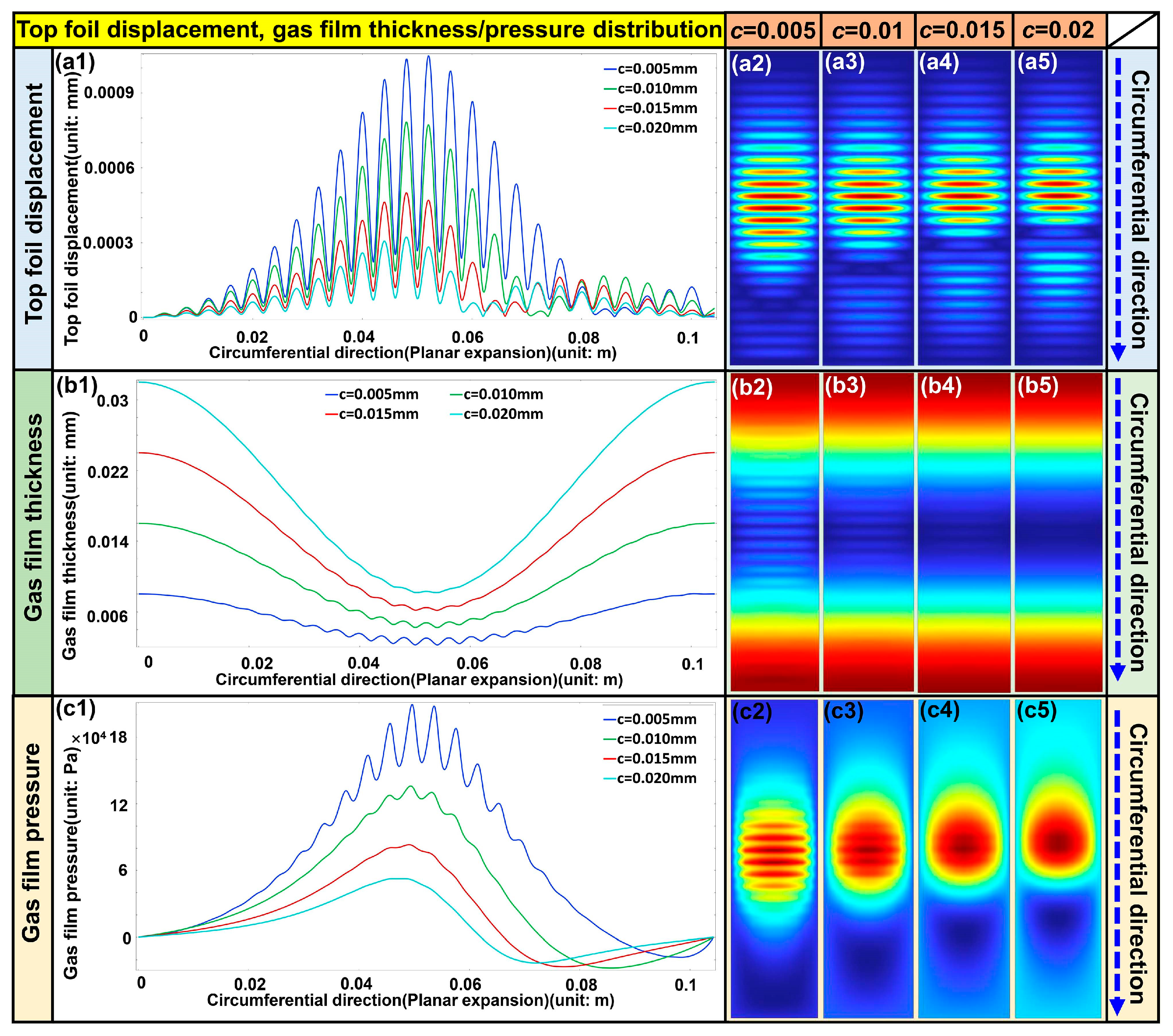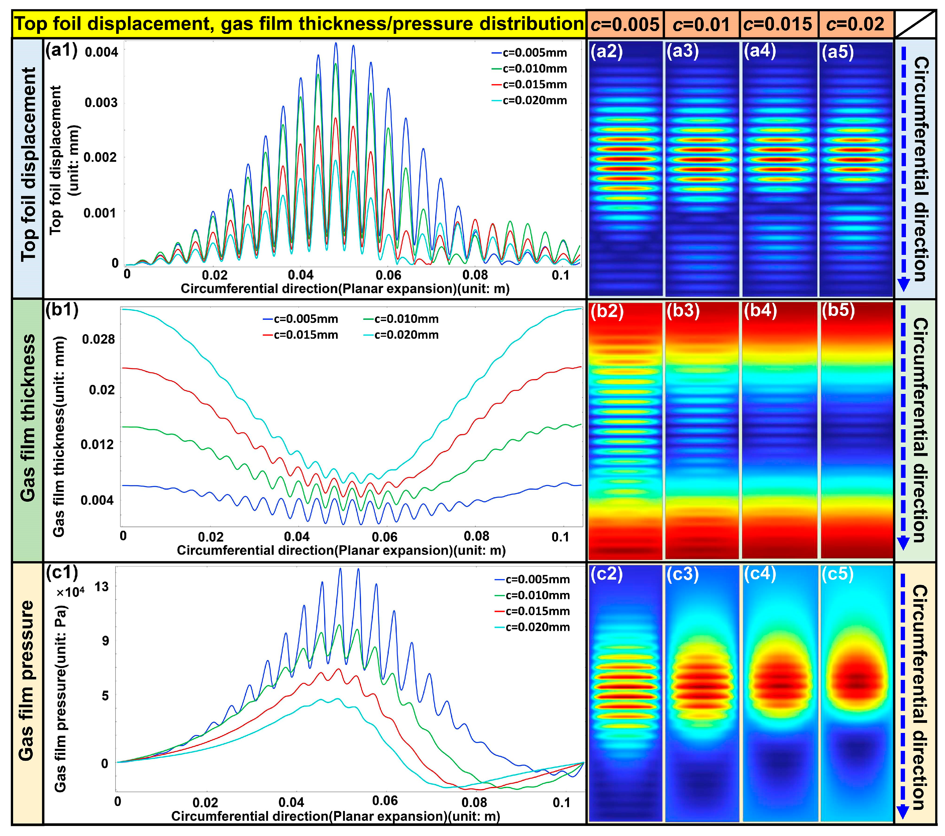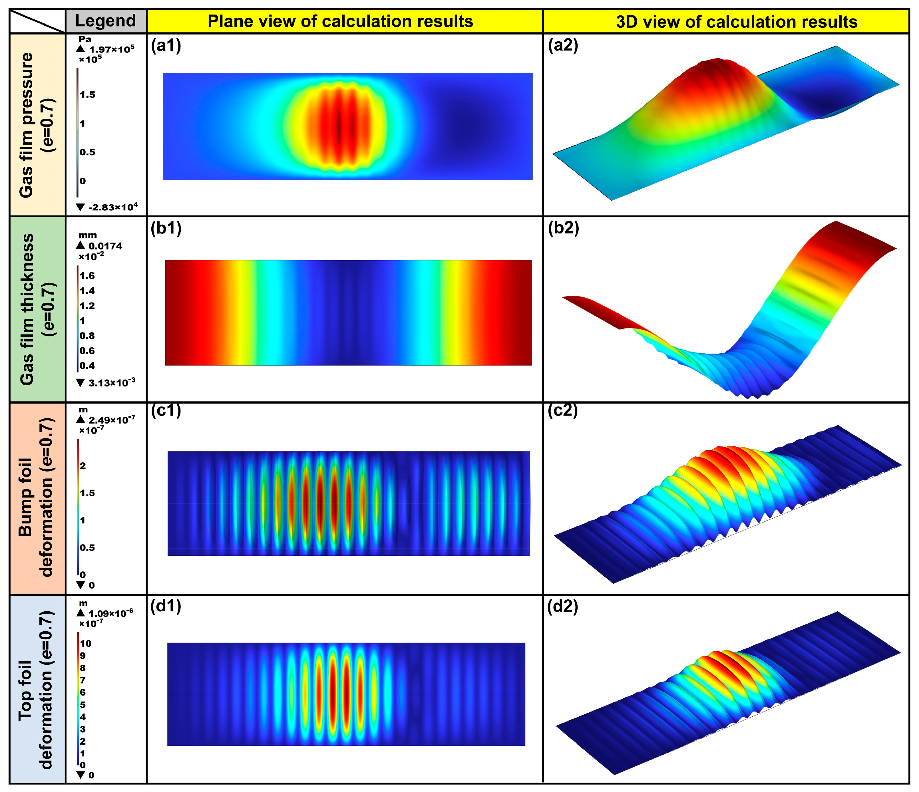 Figure 7(c1,c2) indicates that the wave foil deformation under gas film pressure reaches a maximum of 9.02 × 10